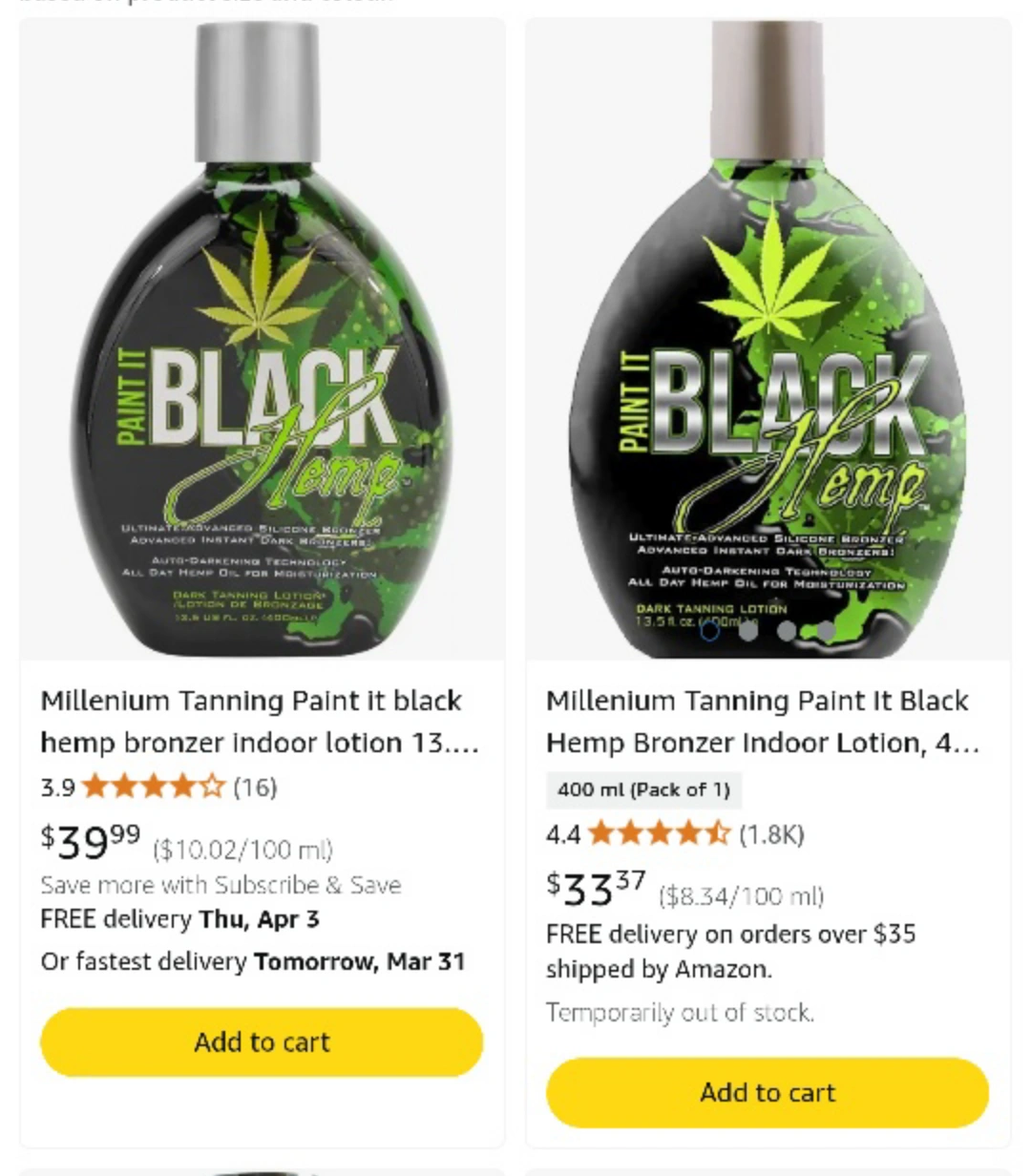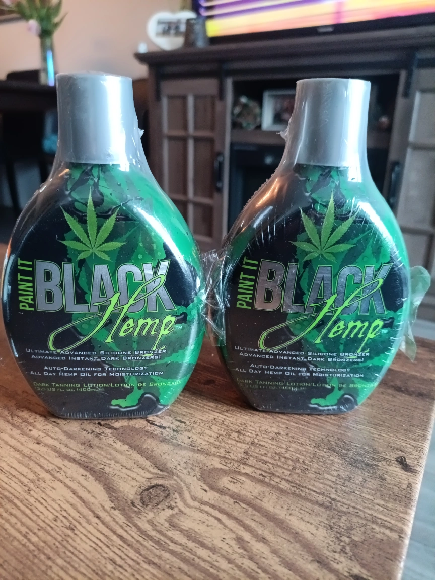 Two bottles of Millennium Tanning Paint It Black Hemp Bronzer indoor lotion. Dark tanning lotion. Ultimate advanced silicone bronzer. Advanced ingredients. Auto-darkening technology. All day moisturizing.