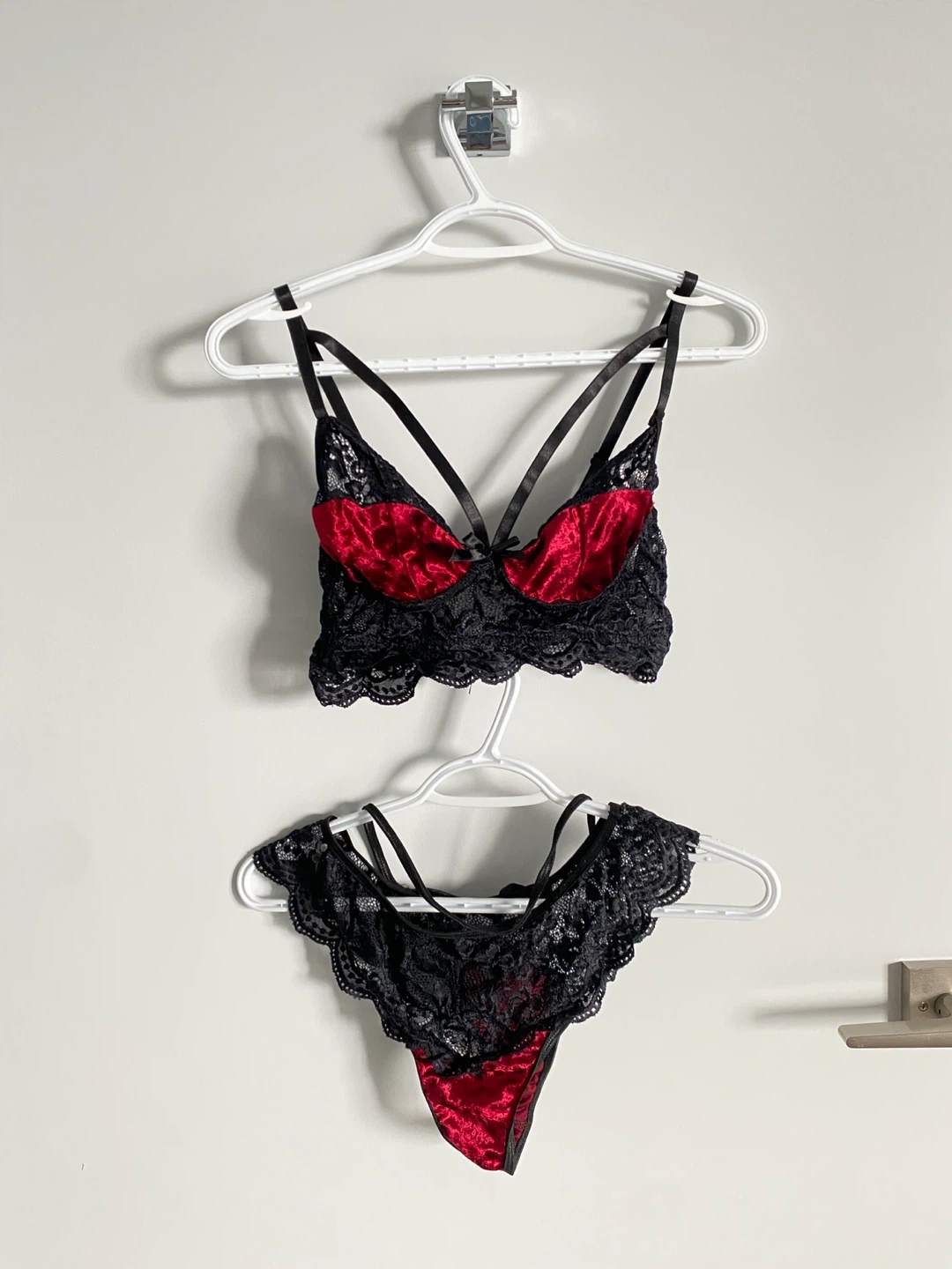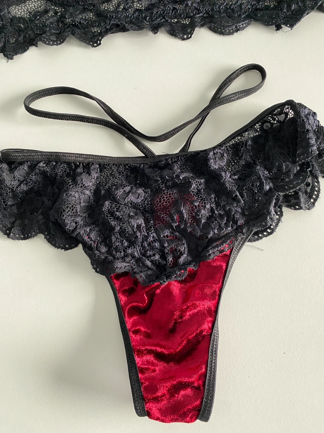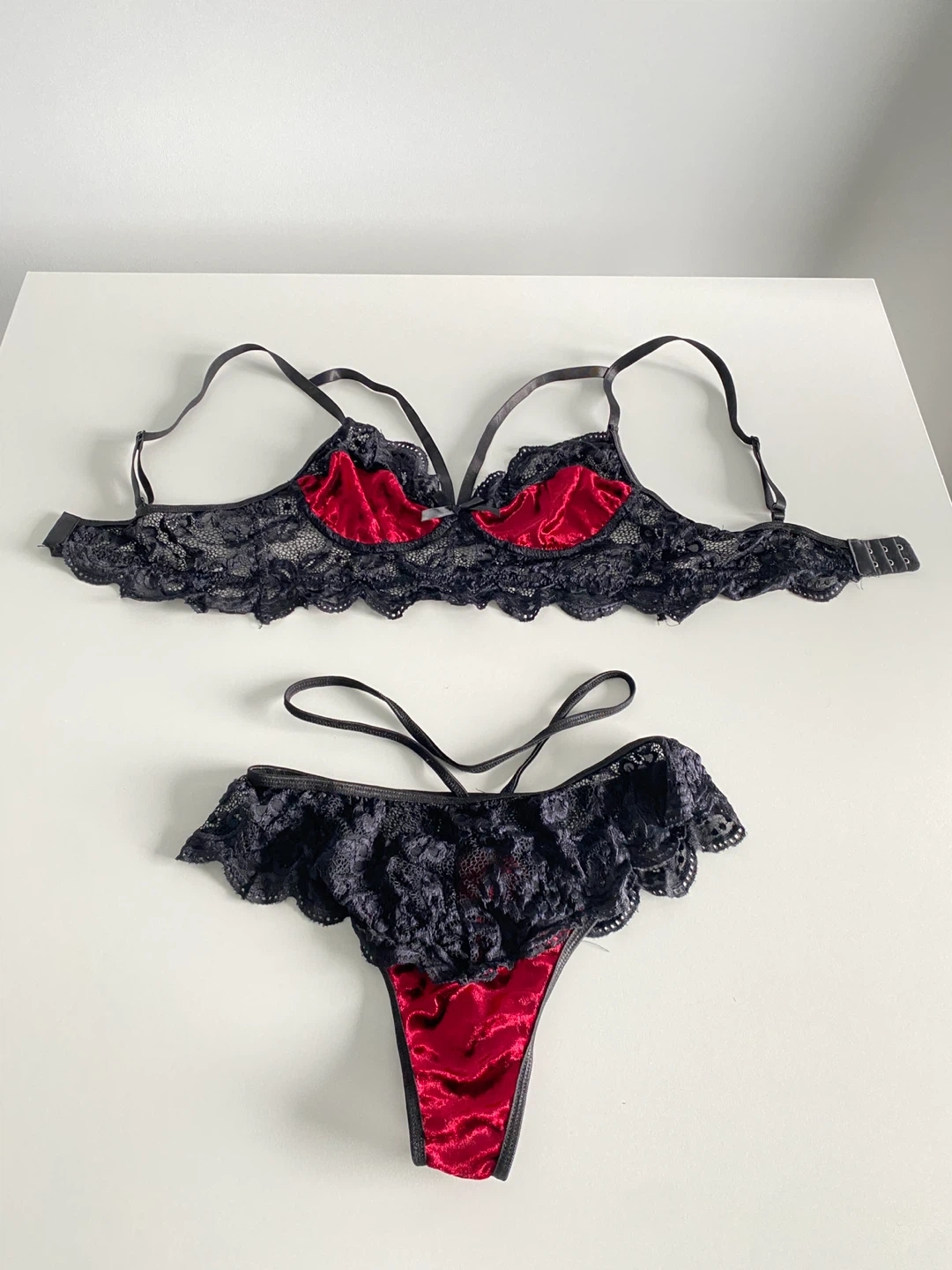 Gorgeous red and black velvet lingerie set in size small. Adjustable straps and hooks. Very comfortable, soft and luxurious fabric. Never worn condition!