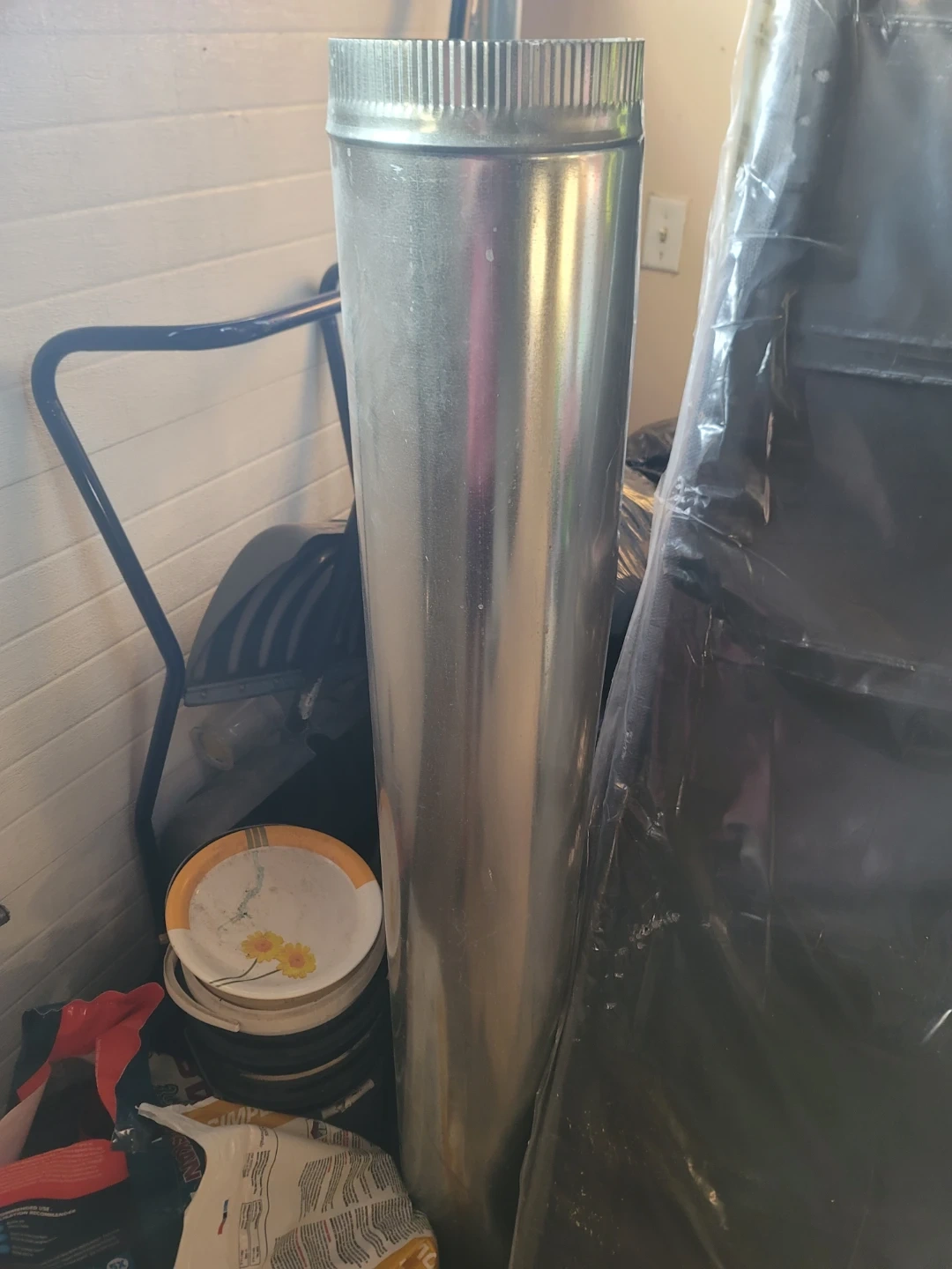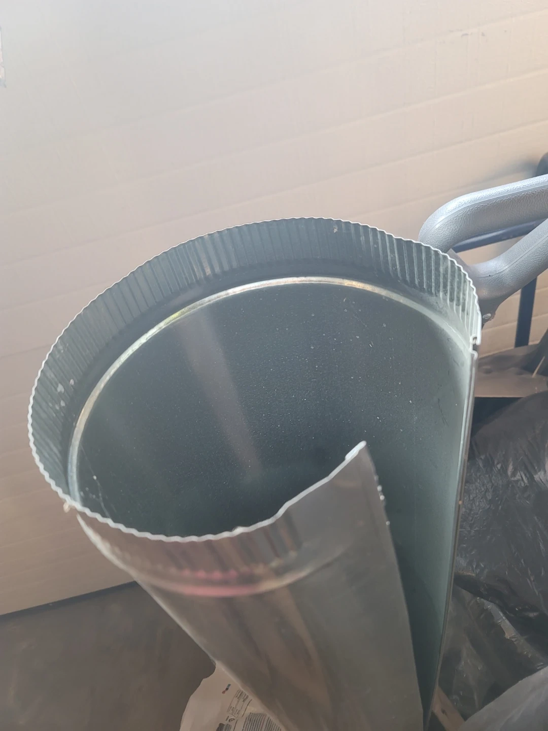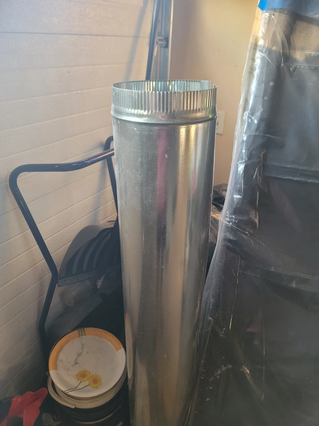 Galvanized metal pipe for dryer vent use. It's a cylinder shape made from metal. This piece is approximately 4 feet long and 6 inches in diameter.