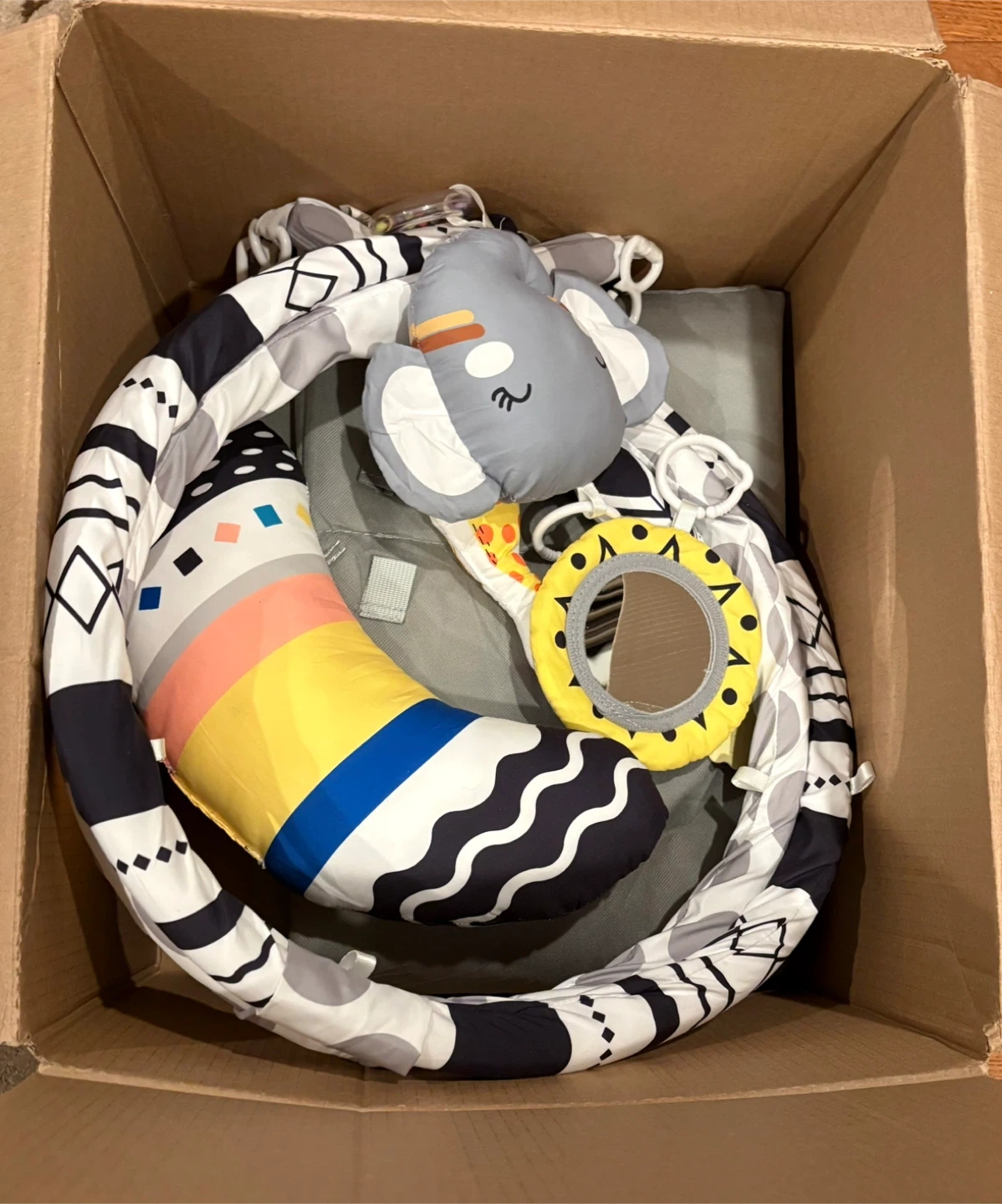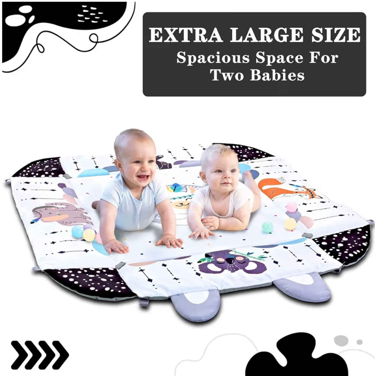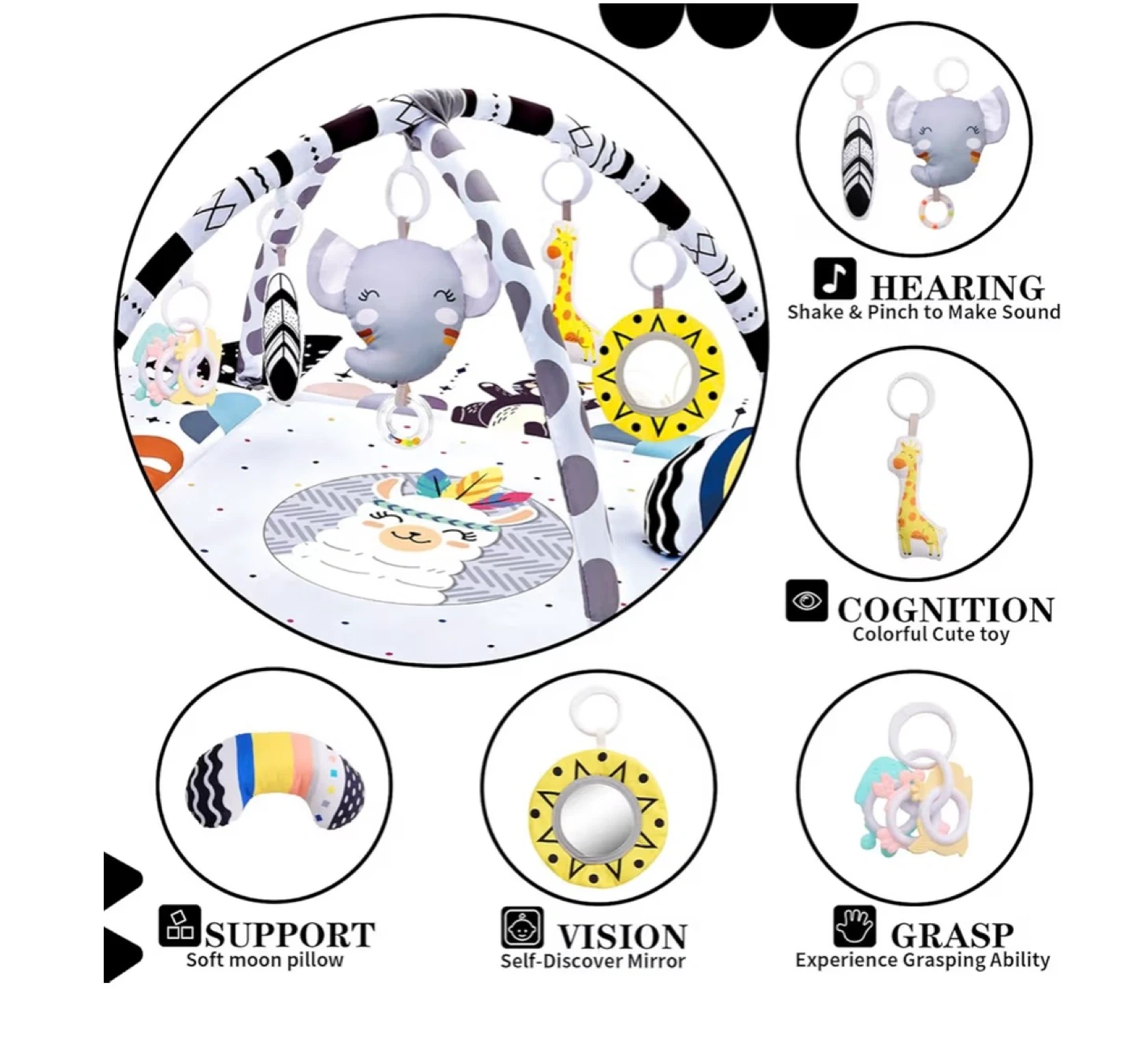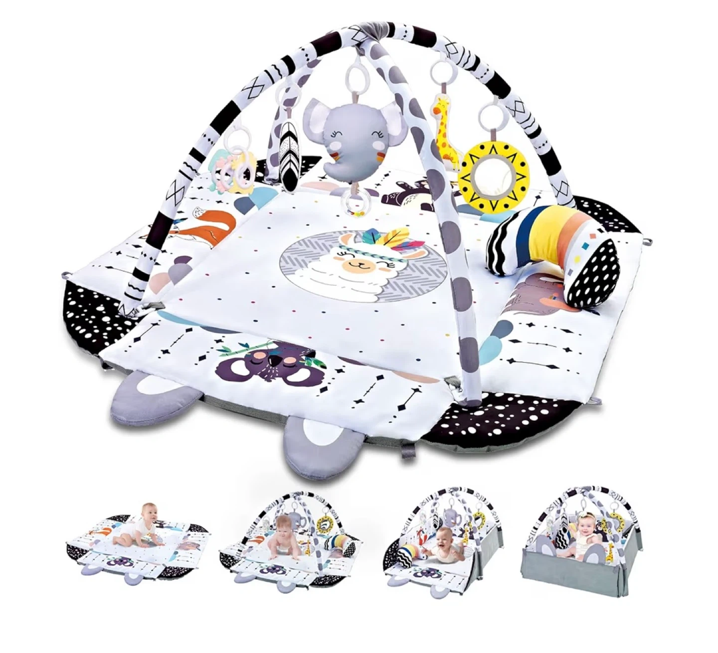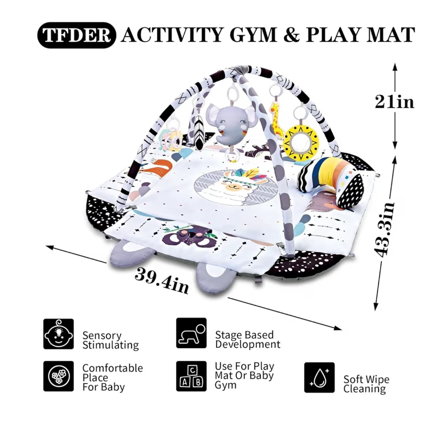 This is a TFDER activity gym and play mat. It's extra large with spacious room for two babies. Includes a soft moon pillow, a self-discover mirror, and several toys for grasping and sensory stimulation. Soft wipe cleaning. It's 39.4in x 43.3in with a height of 21in.