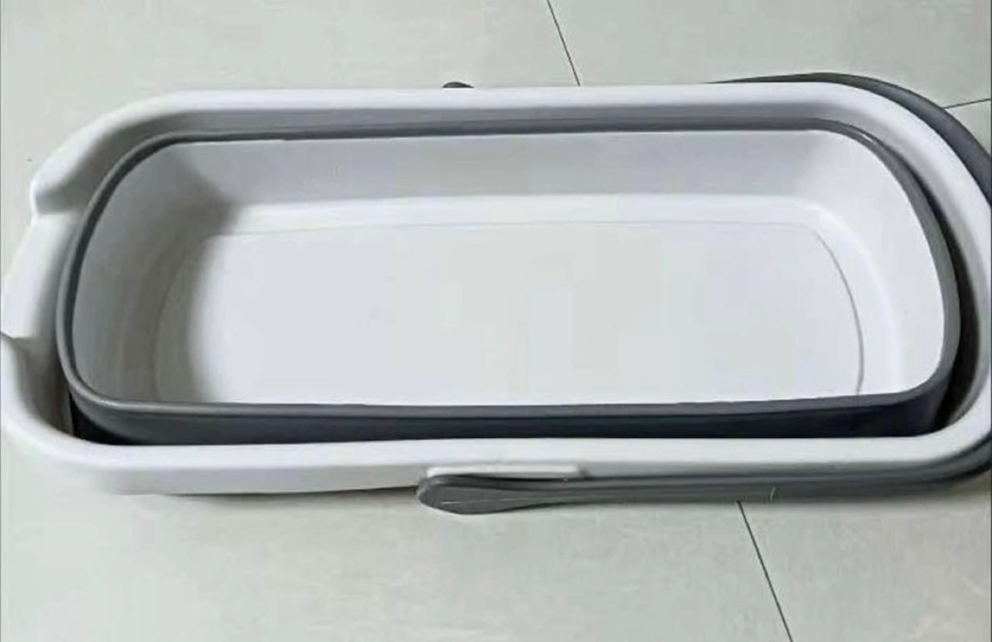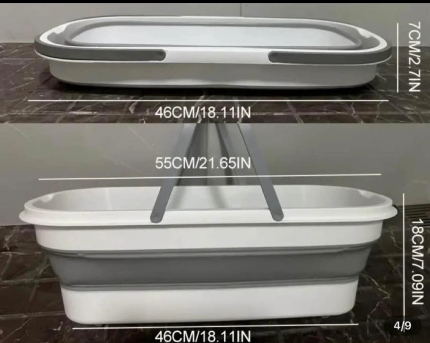 Grey and white plastic foldable basket. Great for laundry, storage, or picnics. Collapses for easy storage. Durable and lightweight.