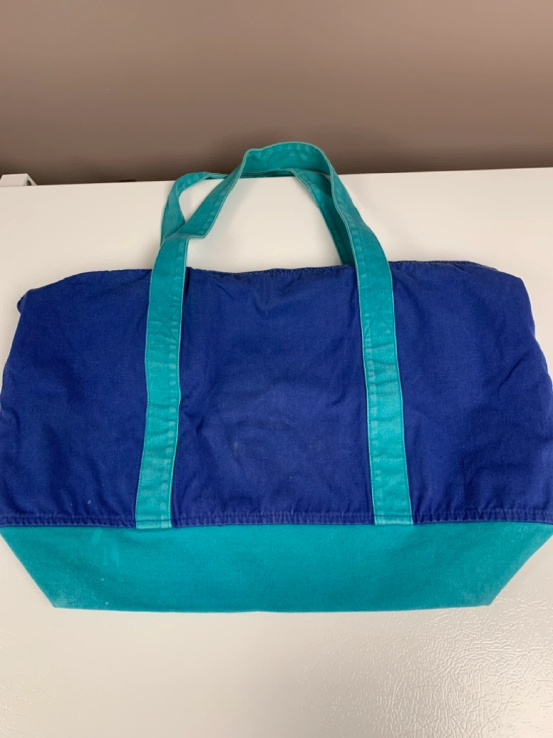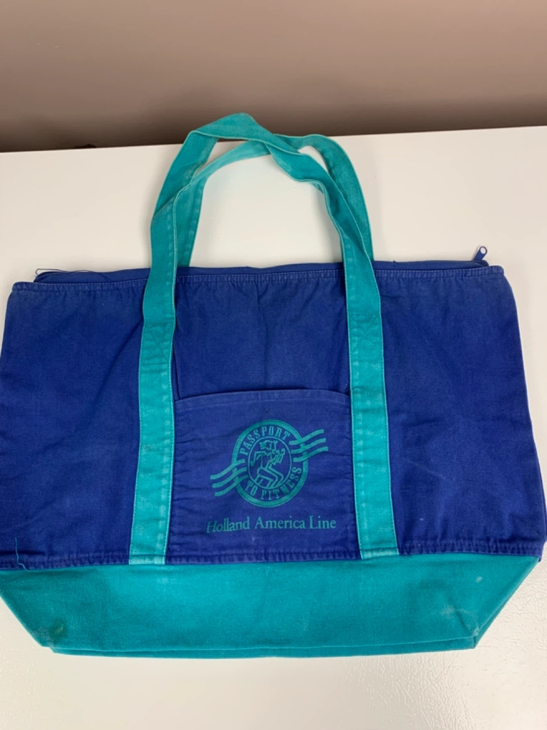 Canvas duffel bag with two handles and a zippered top. Features "Passport to Fitness" logo and "Holland America Line" text. Blue with teal accents. It has a front pocket.