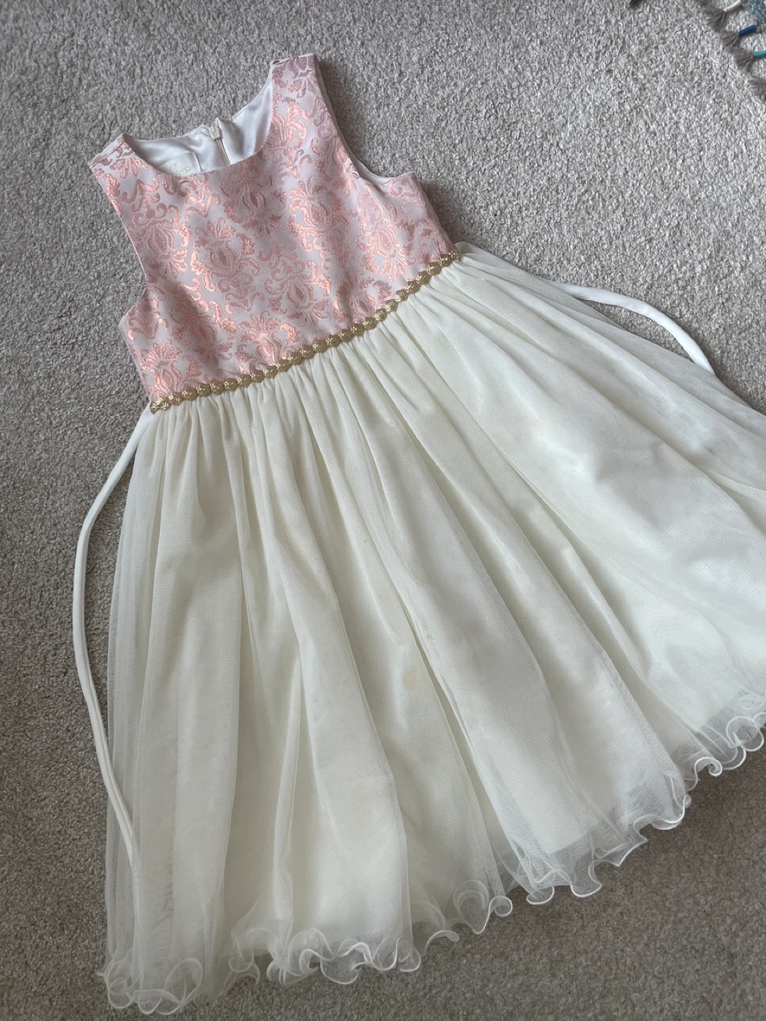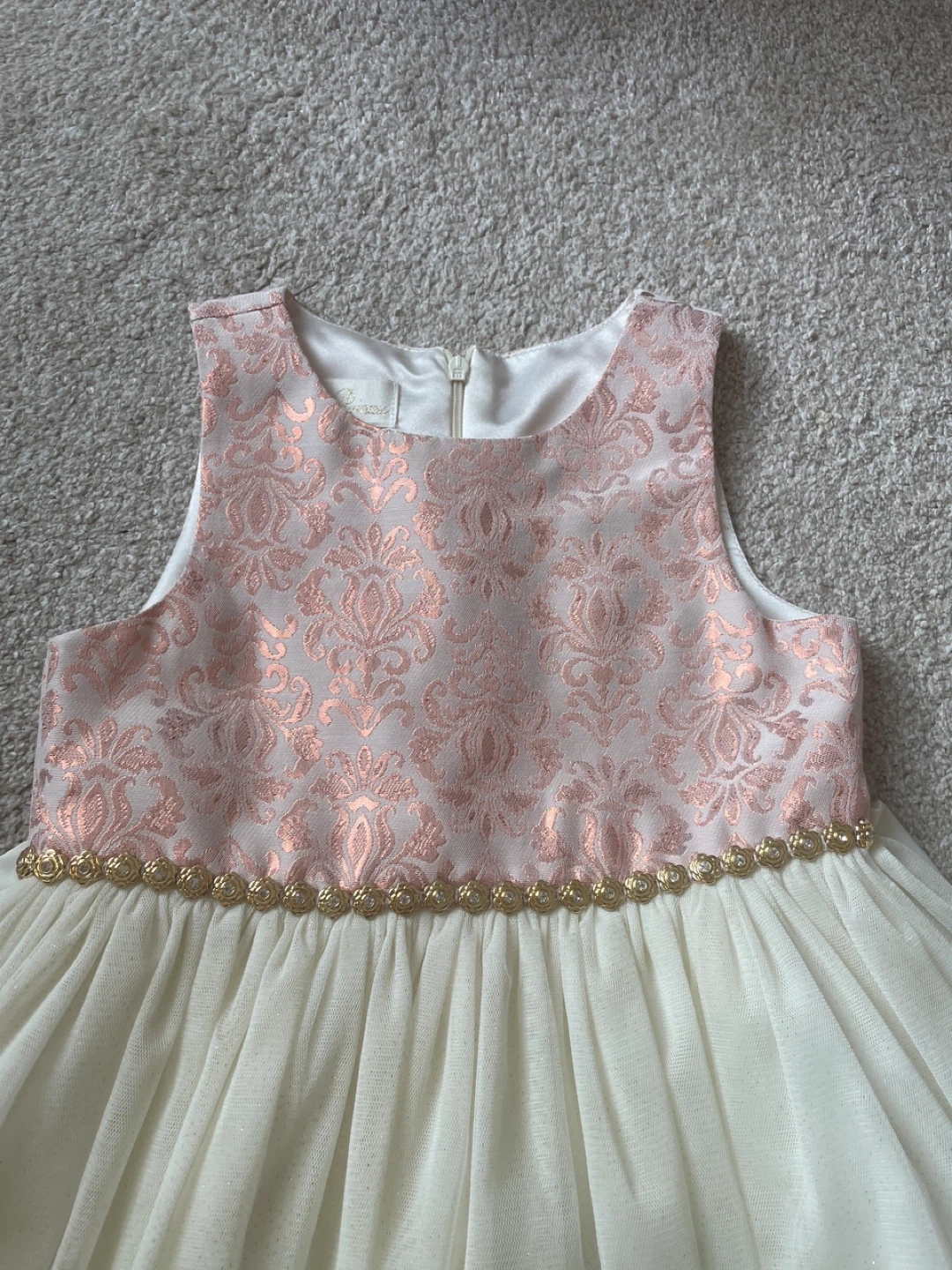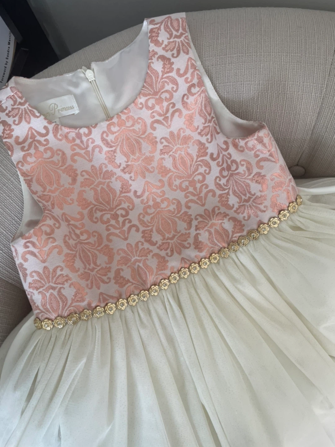 Gorgeous girls' dress with a pink damask print bodice and a full white tulle skirt. It features a gold trim at the waist and a zipper back closure. This pretty dress is perfect for special occasions!