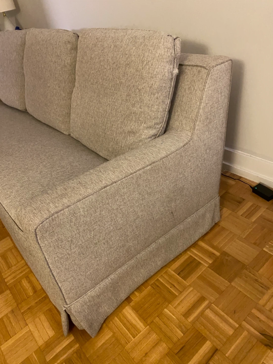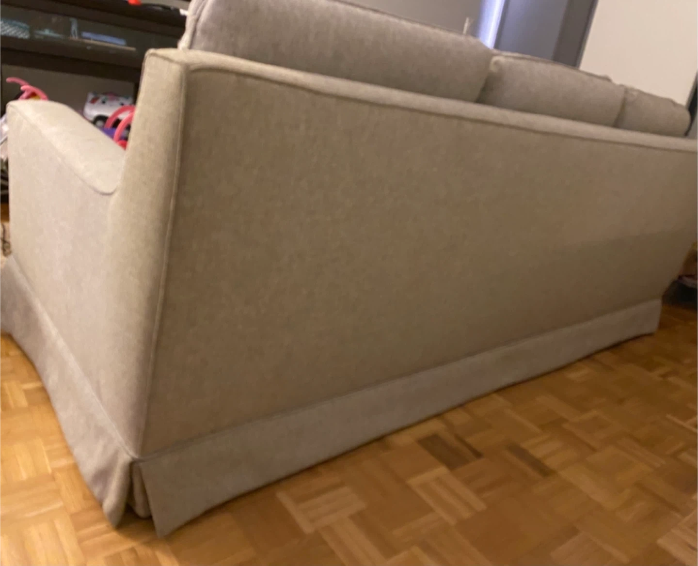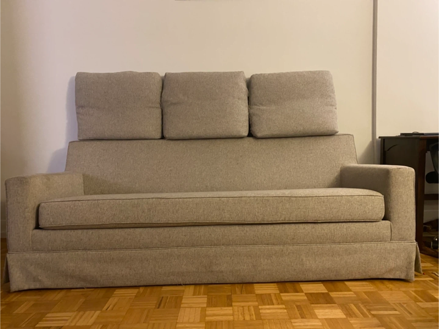 This is a beige sofa with three back cushions and a removable skirted base. Its fabric appears to be a textured linen blend. This sofa would be a comfy addition to any living space.