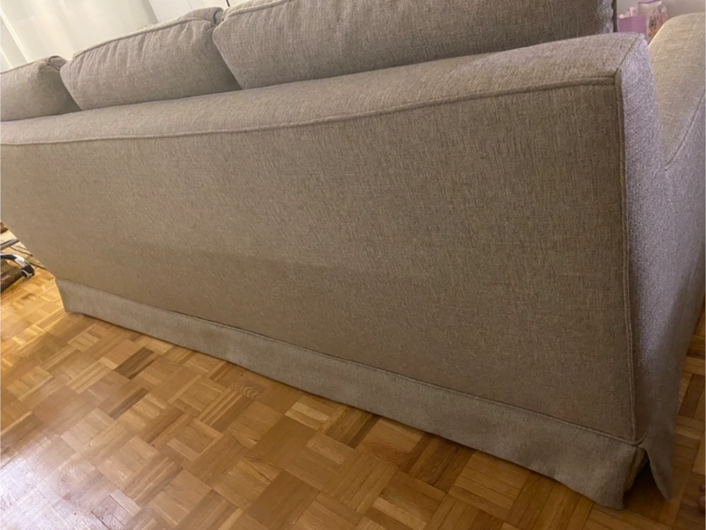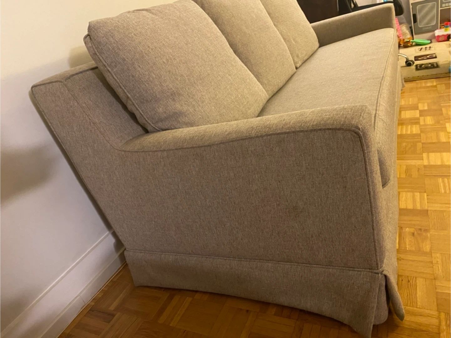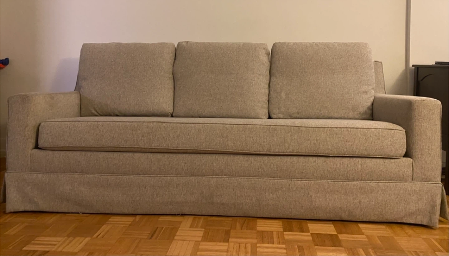 This is a beige sofa with three back cushions and a removable skirted base. Its fabric appears to be a textured linen blend. This sofa would be a comfy addition to any living space.