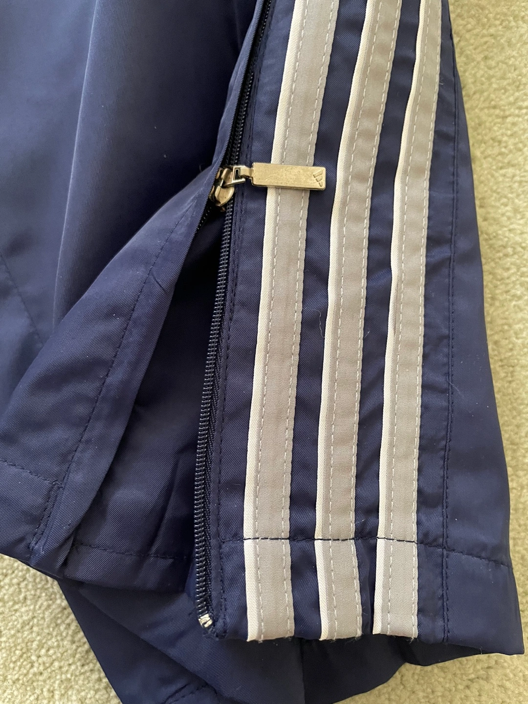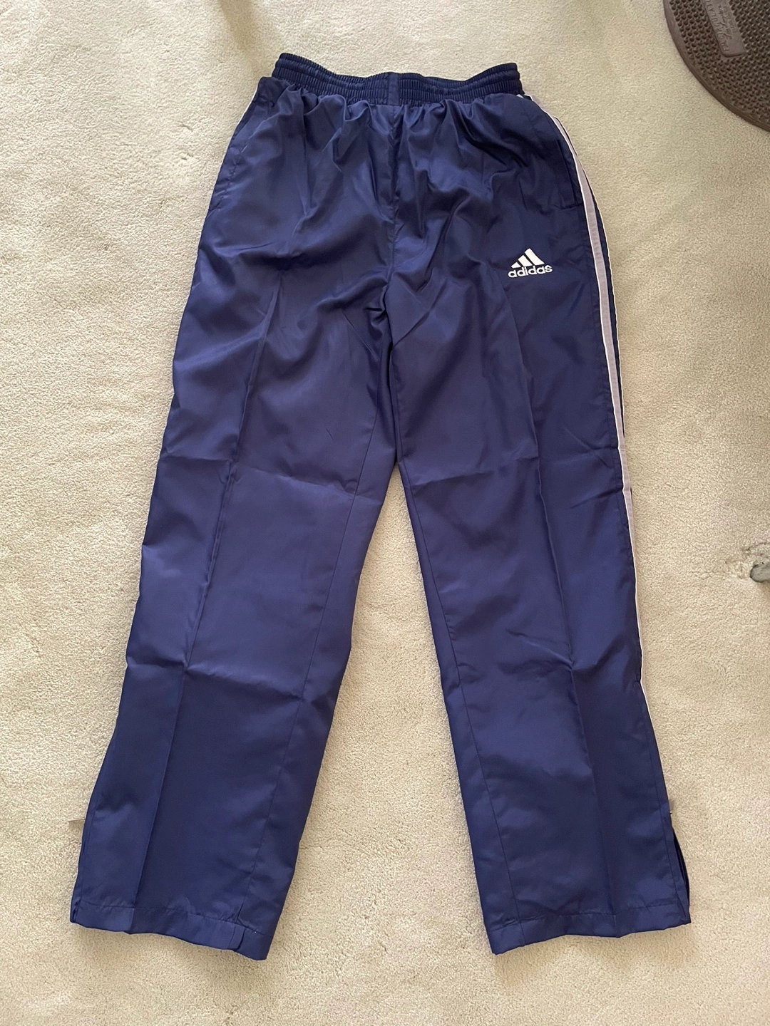Men's Adidas track pants. Navy blue with grey stripes. Size XL. Elastic waistband with drawstring inside. Side pockets and half-zipper at ankle. Pant is lined inside up to below the calf as shown in photo.