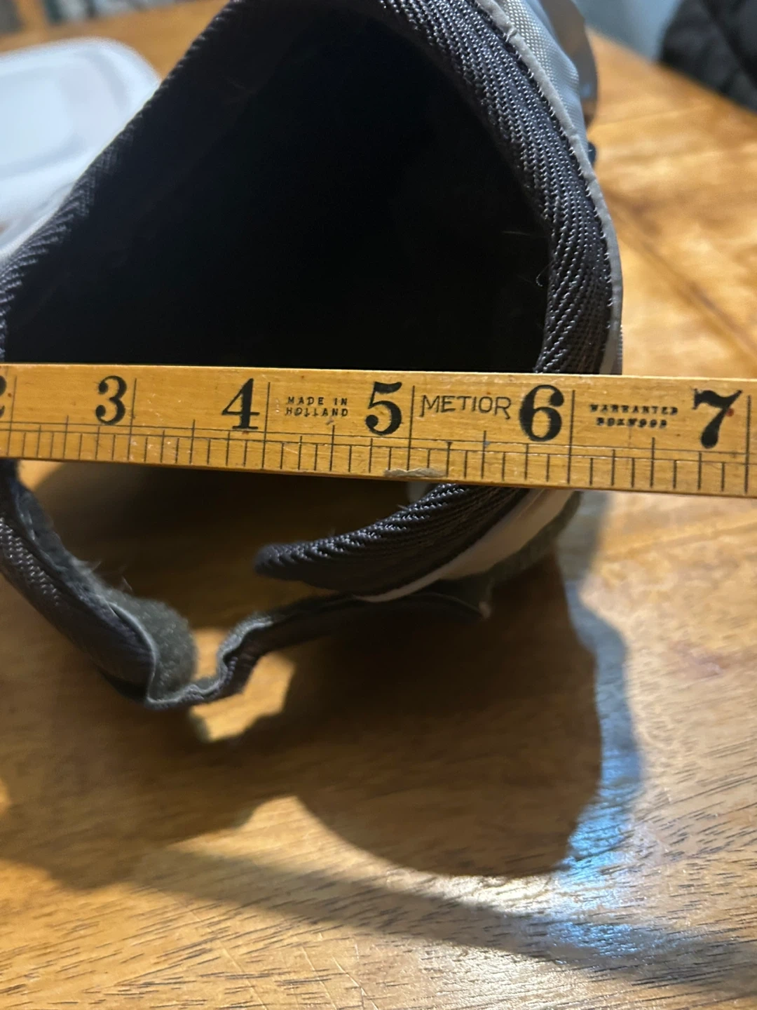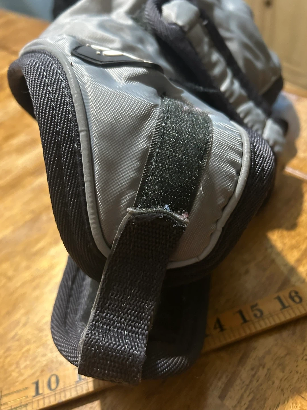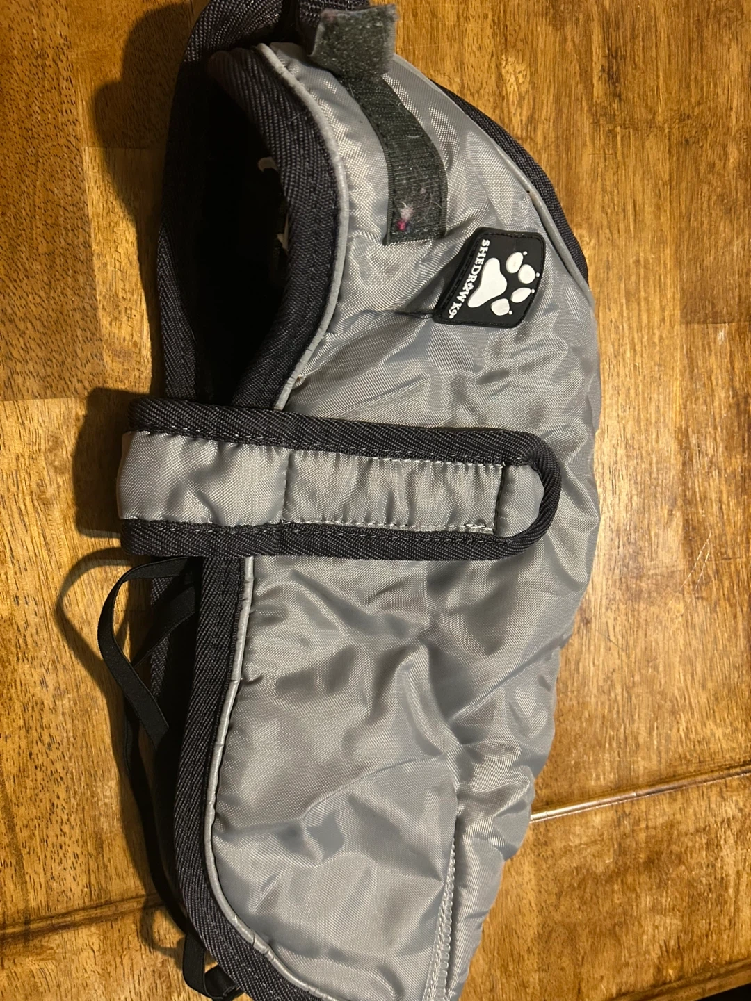 Grey dog winter vest with black trim. Made of nylon material. Chest measures approximately 16 inches and length is about 6 inches.