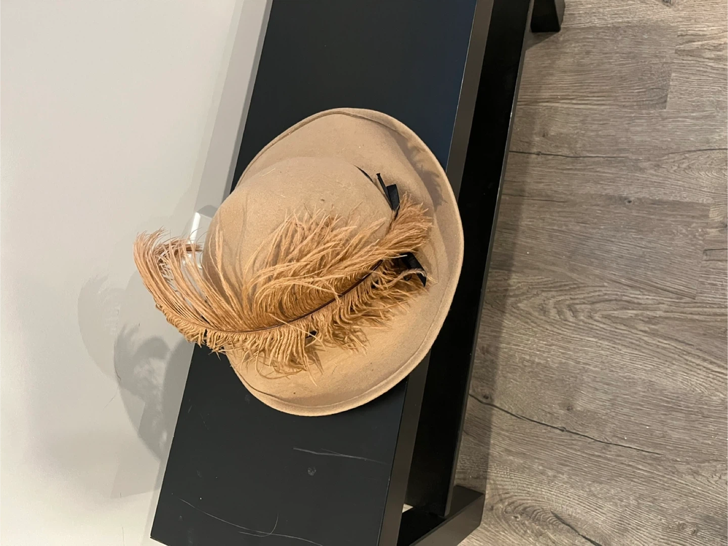 A stylish beige fashion hat adorned with a prominent feather accent and a black ribbon detail. This hat features a classic design suitable for various occasions. Material appears to be felt.
