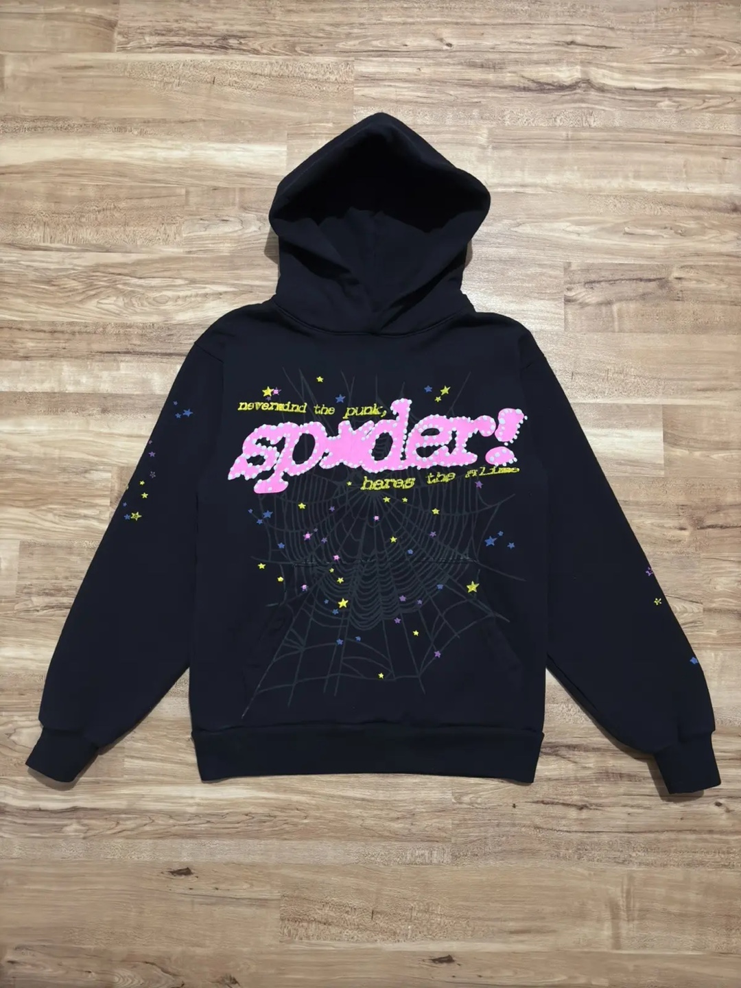 Black hoodie featuring a spider graphic. Long sleeves, drawstring hood. Embroidered design with stars and spiderweb.
