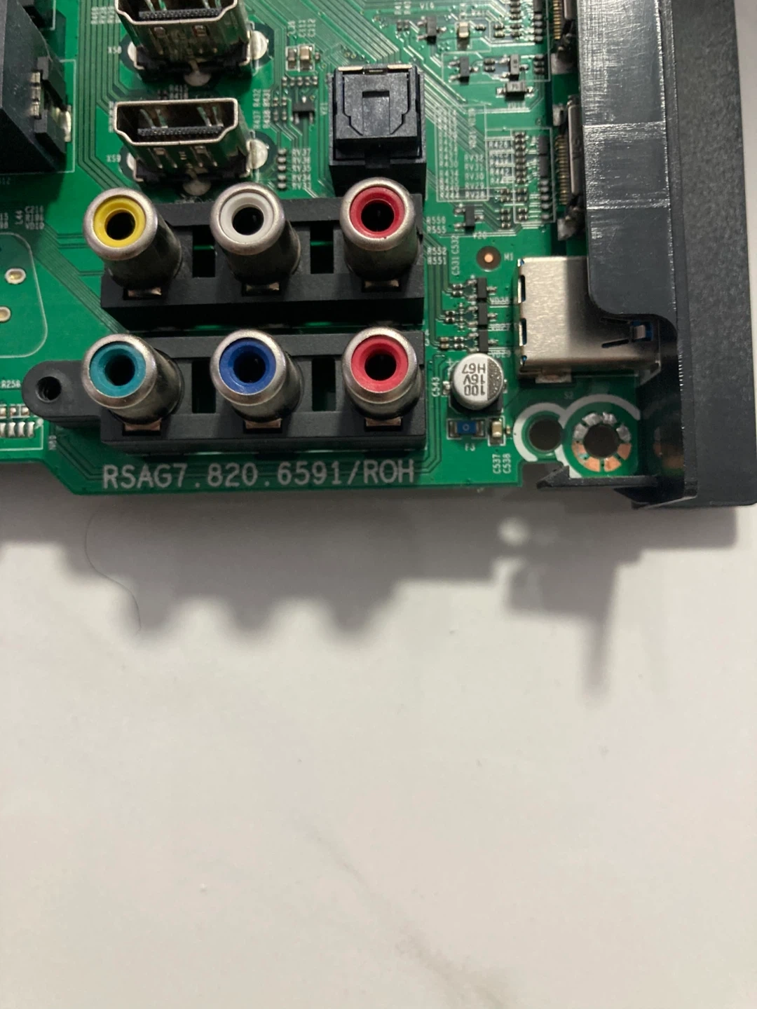 This is a TV mainboard identified with the part number RSAG7.820.6591/ROH. It features RCA component and composite inputs, along with HDMI and Ethernet ports. It also includes a CI slot for additional modules.