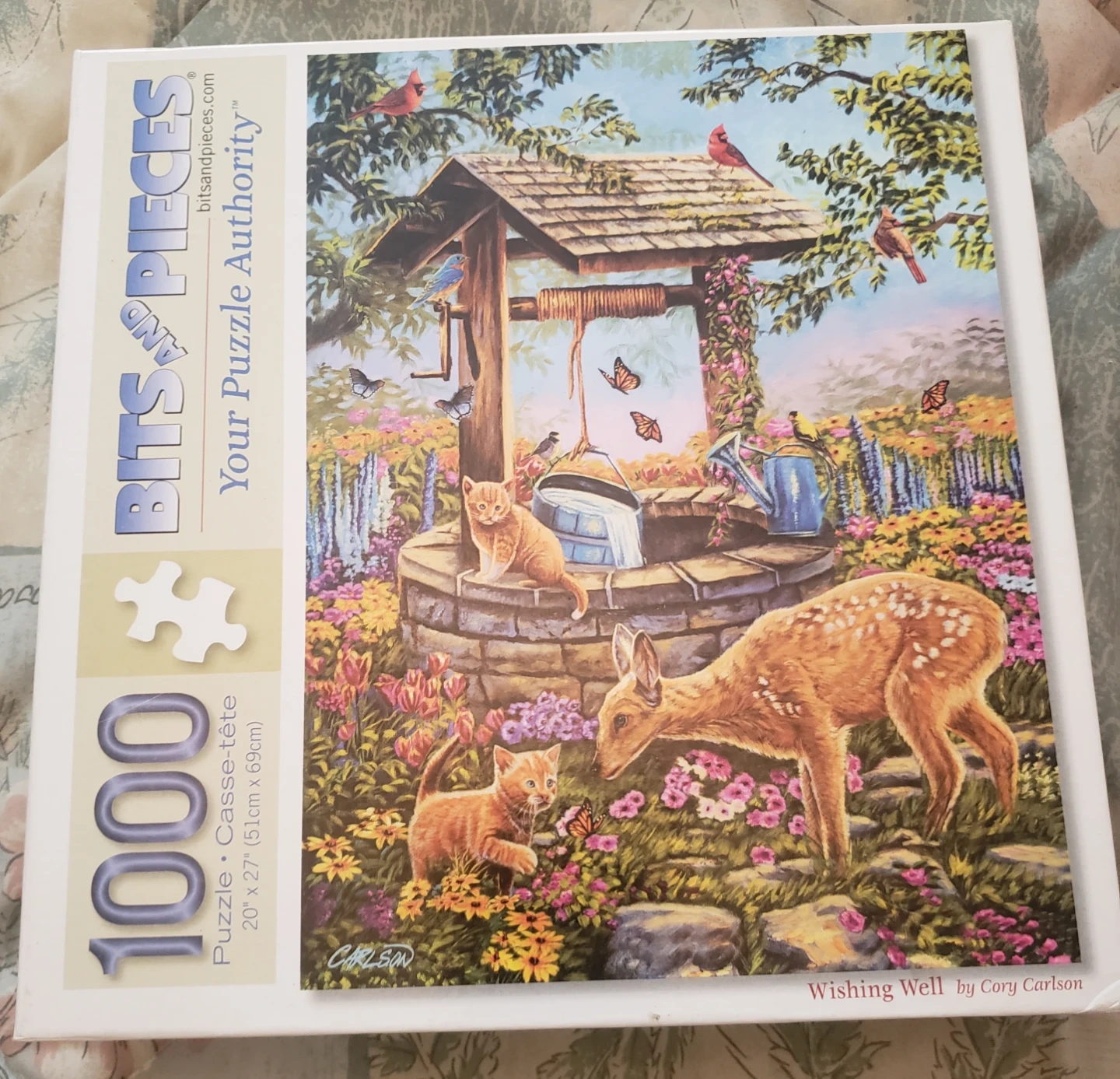 This Bits and Pieces 1000-piece jigsaw puzzle features artwork titled 'Wishing Well' by Cory Carlson. It measures 20" x 27" when completed. It's a lovely scene with kittens and a fawn by a well.