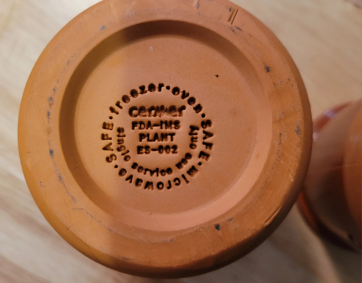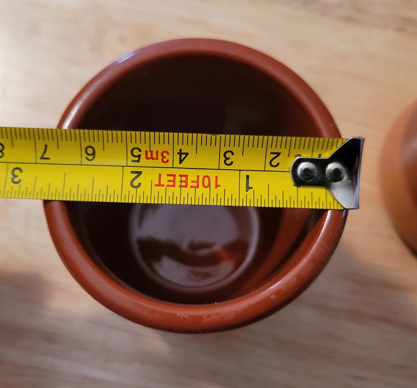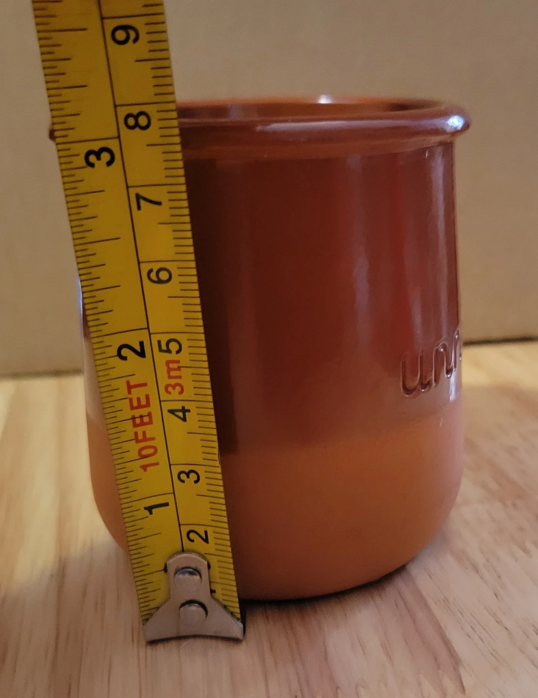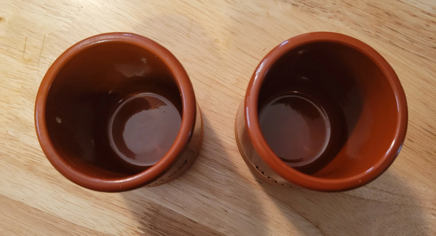 Set of two Unnico ceramic ramekins. Brown glazed exterior with unglazed terracotta base. Each ramekin measures approximately 3 inches tall with a 2.75 inch opening diameter. Microwave, freezer, and oven safe. Single service size. Price for both.