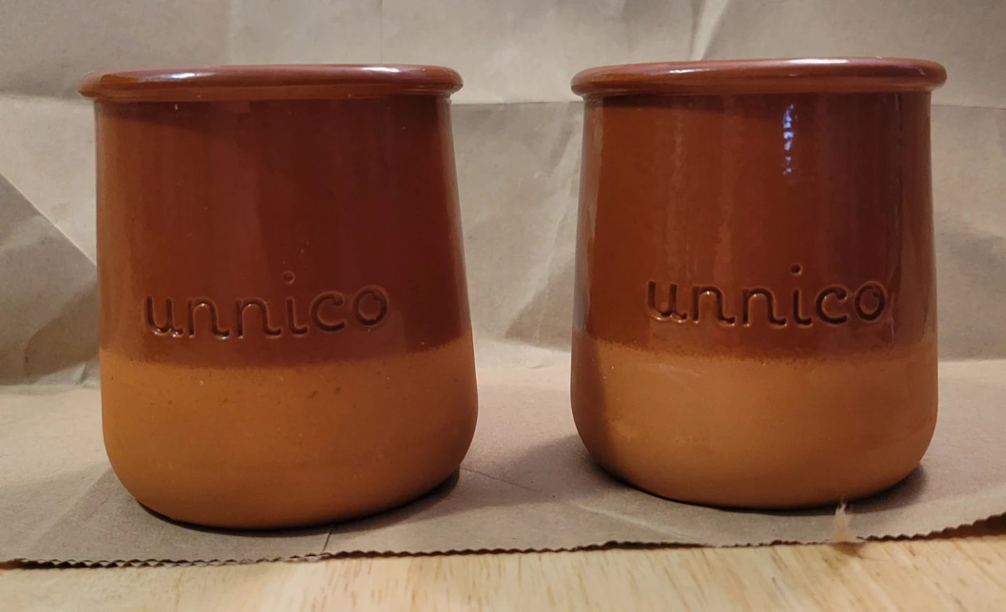 Set of two Unnico ceramic ramekins. Brown glazed exterior with unglazed terracotta base. Each ramekin measures approximately 3 inches tall with a 2.75 inch opening diameter. Microwave, freezer, and oven safe. Single service size. Price for both.