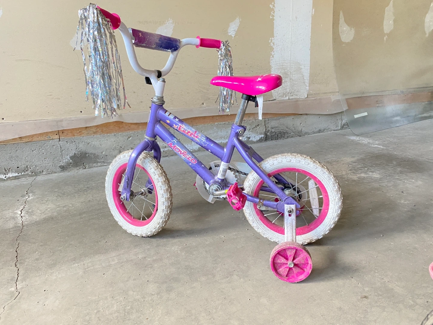 This is a kids' training bike, perfect for a beginner rider. It's purple with pink accents, including the seat and handlebar grips. Comes with sparkly streamers on the handlebars and training wheels.