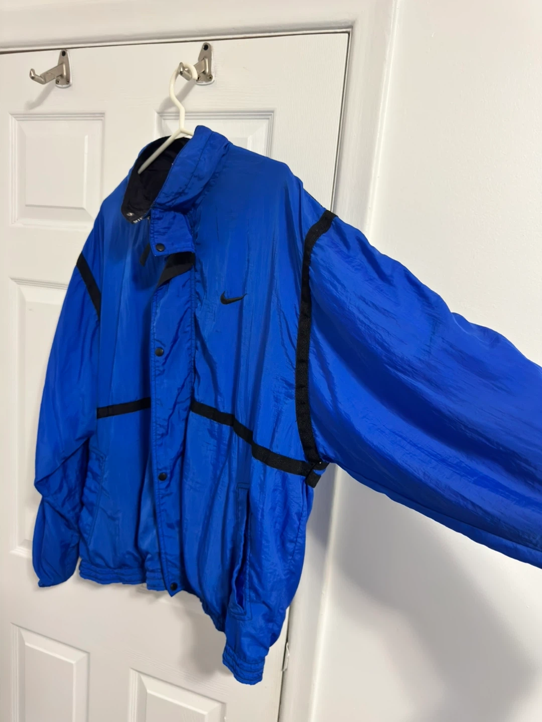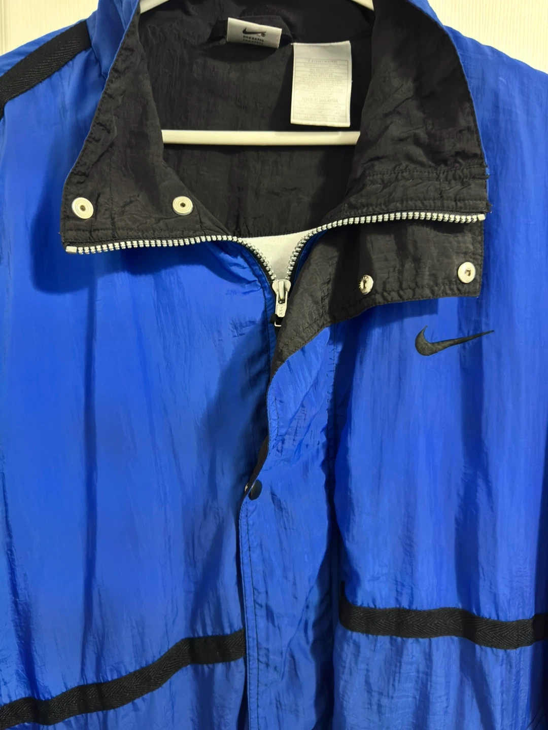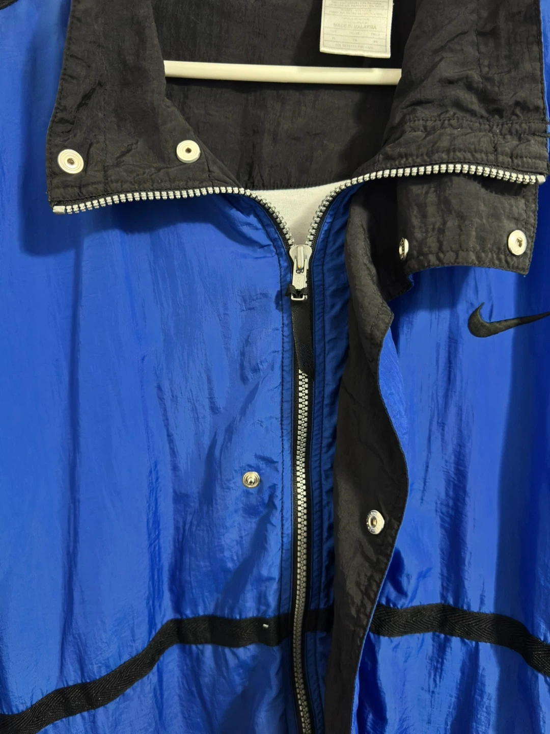 Selling a Nike windbreaker jacket in blue and black. It's in great condition and perfect for layering! The jacket features a zipper and button closure, as well as the classic Nike swoosh logo. Made in Malaysia. It's a stylish and functional piece for any wardrobe