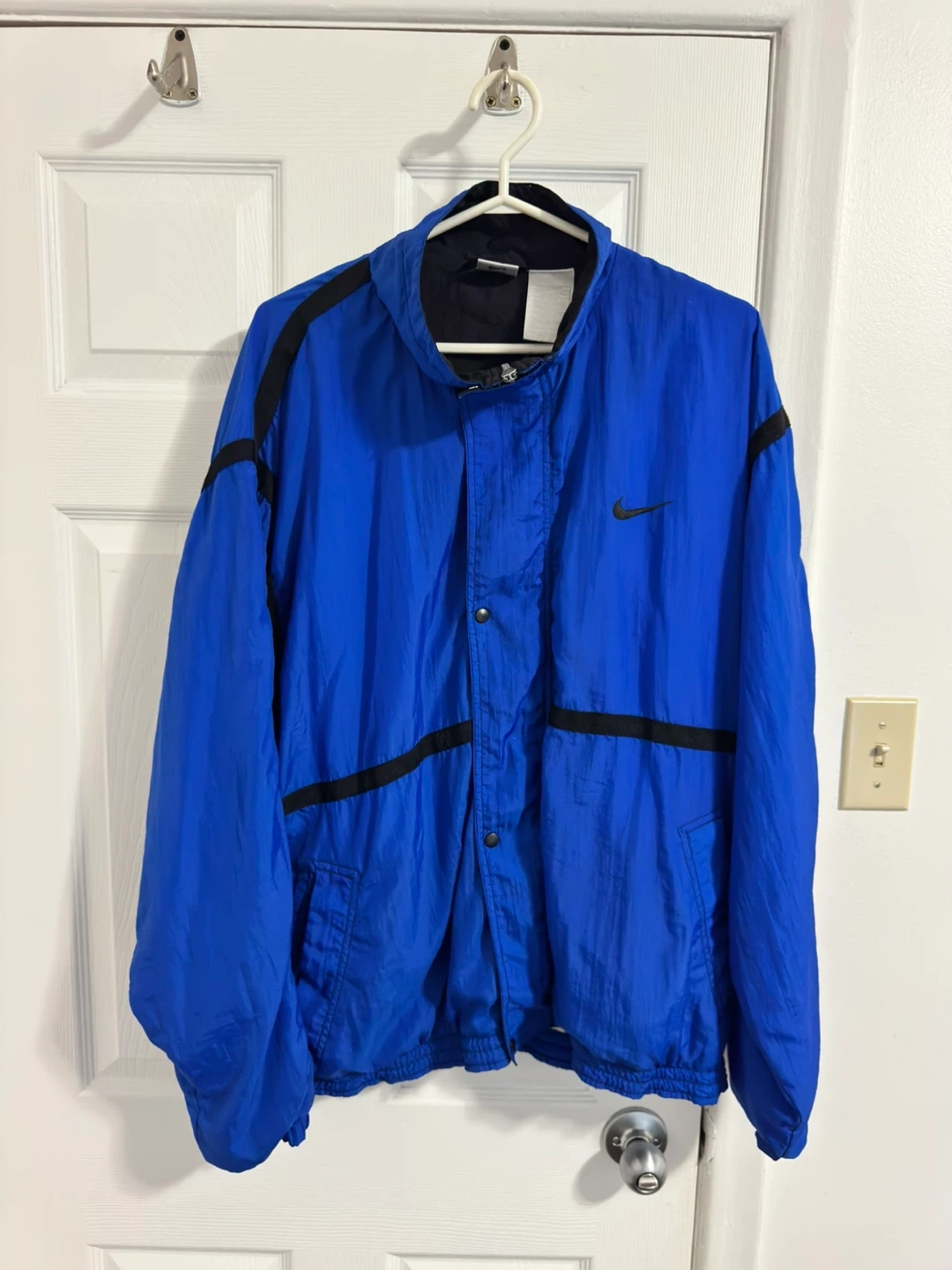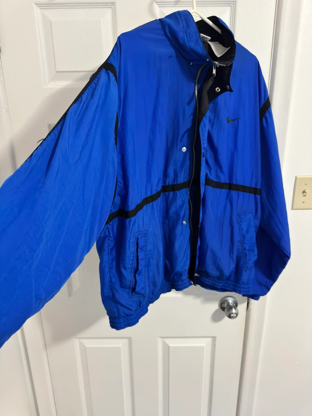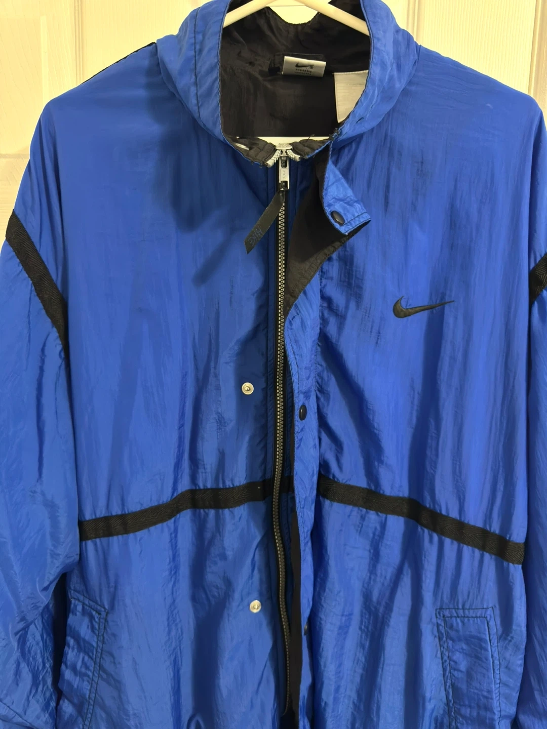 Selling a Nike windbreaker jacket in blue and black. It's in great condition and perfect for layering! The jacket features a zipper and button closure, as well as the classic Nike swoosh logo. Made in Malaysia. It's a stylish and functional piece for any wardrobe
