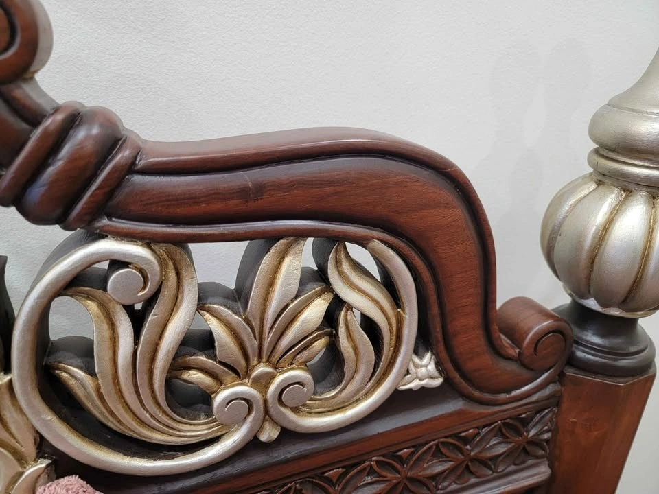 Stunning 3-piece living room set. Solid carved rosewood with beautiful ornate details. Light patterned upholstery. Set includes: 1 x Triple-Arched 3-Seater Sofa, 2 x Matching Armless "Throne" Chairs. Matching glass top coffee table and side tables also available separately. Material: Premium Solid Rosewood (Heavy, durable, and investment-grade). Condition: Pristine / Like New. Fabric: High-end champagne/lavender brocade with matching throw pillows. Style: Regal / Ornate / Colonial. This is authentic, heavy-weight Rosewood furniture. Please bring adequate help for transport.