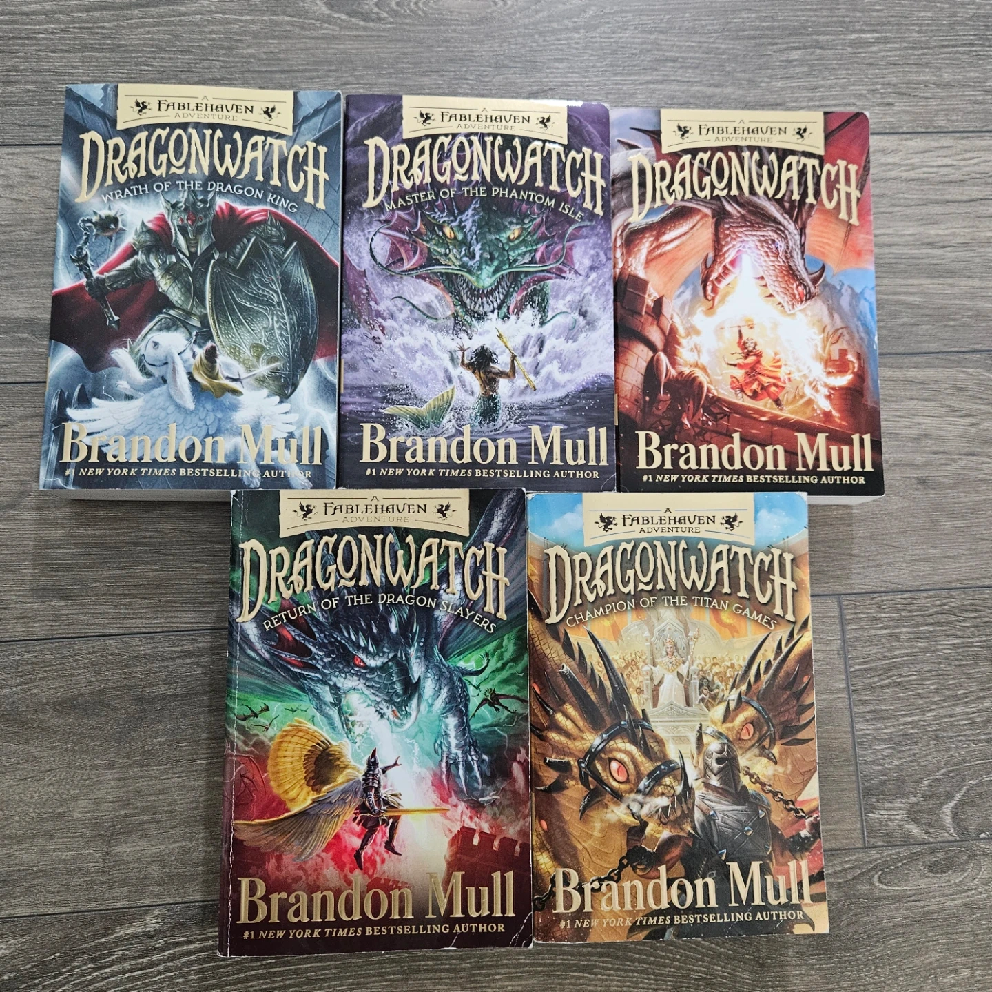 Collection of 5 Dragonwatch books by Brandon Mull. Includes "Wrath of the Dragon King", "Master of the Phantom Isle", "The Dragon with the Stone Heart", "Return of the Dragon Slayers", and "Champion of the Titan Games". Books are paperback. Selling as serries.