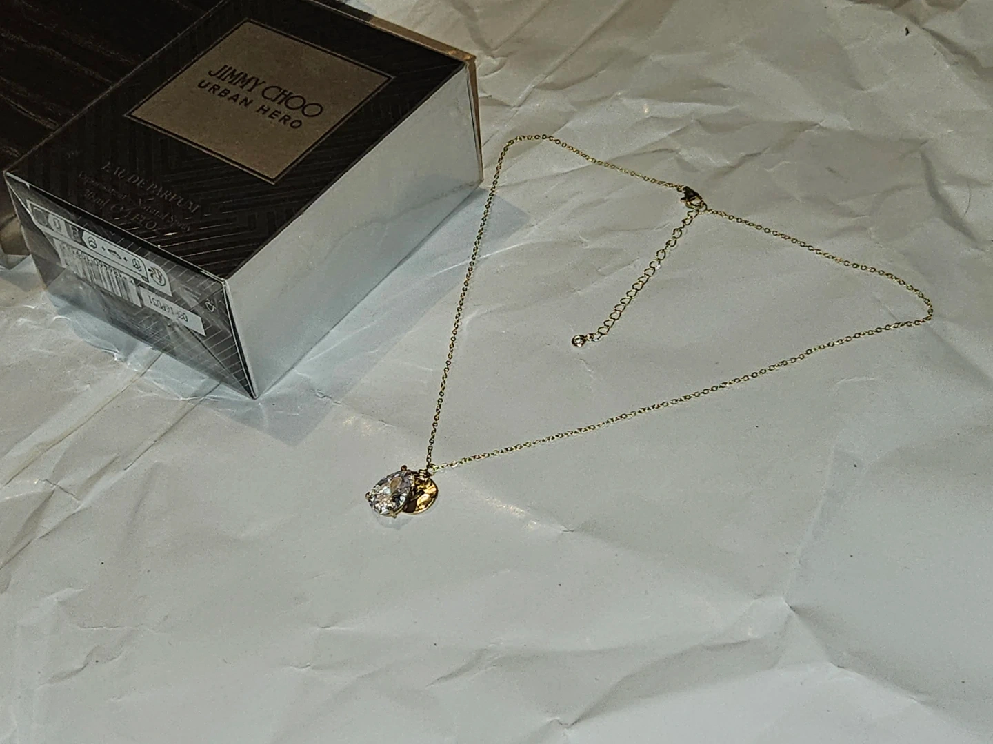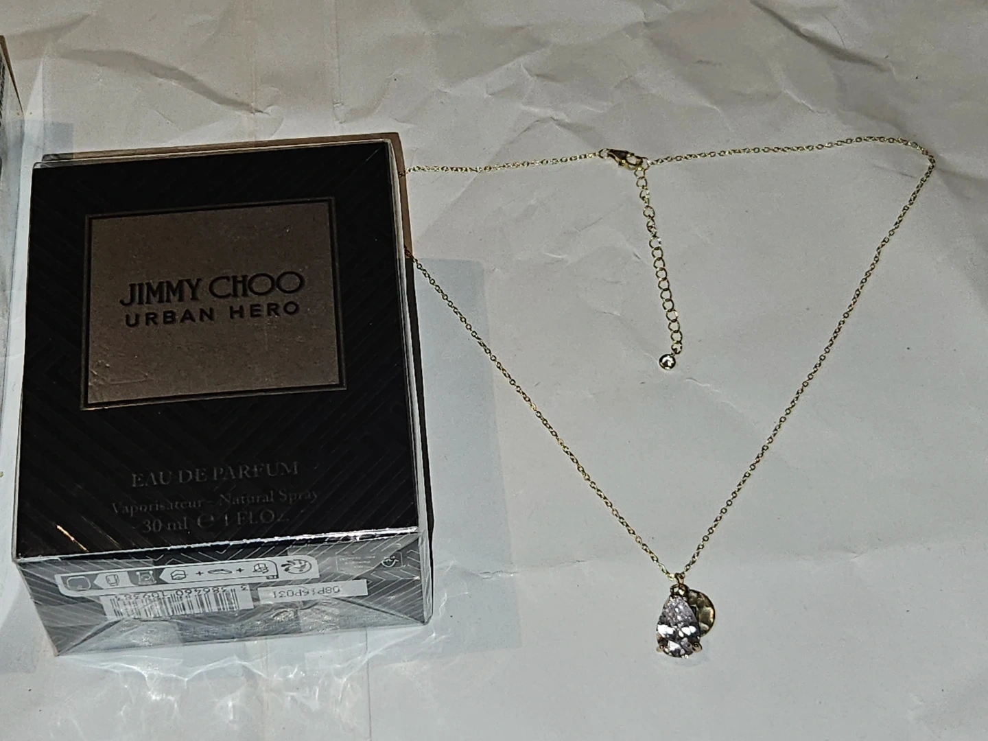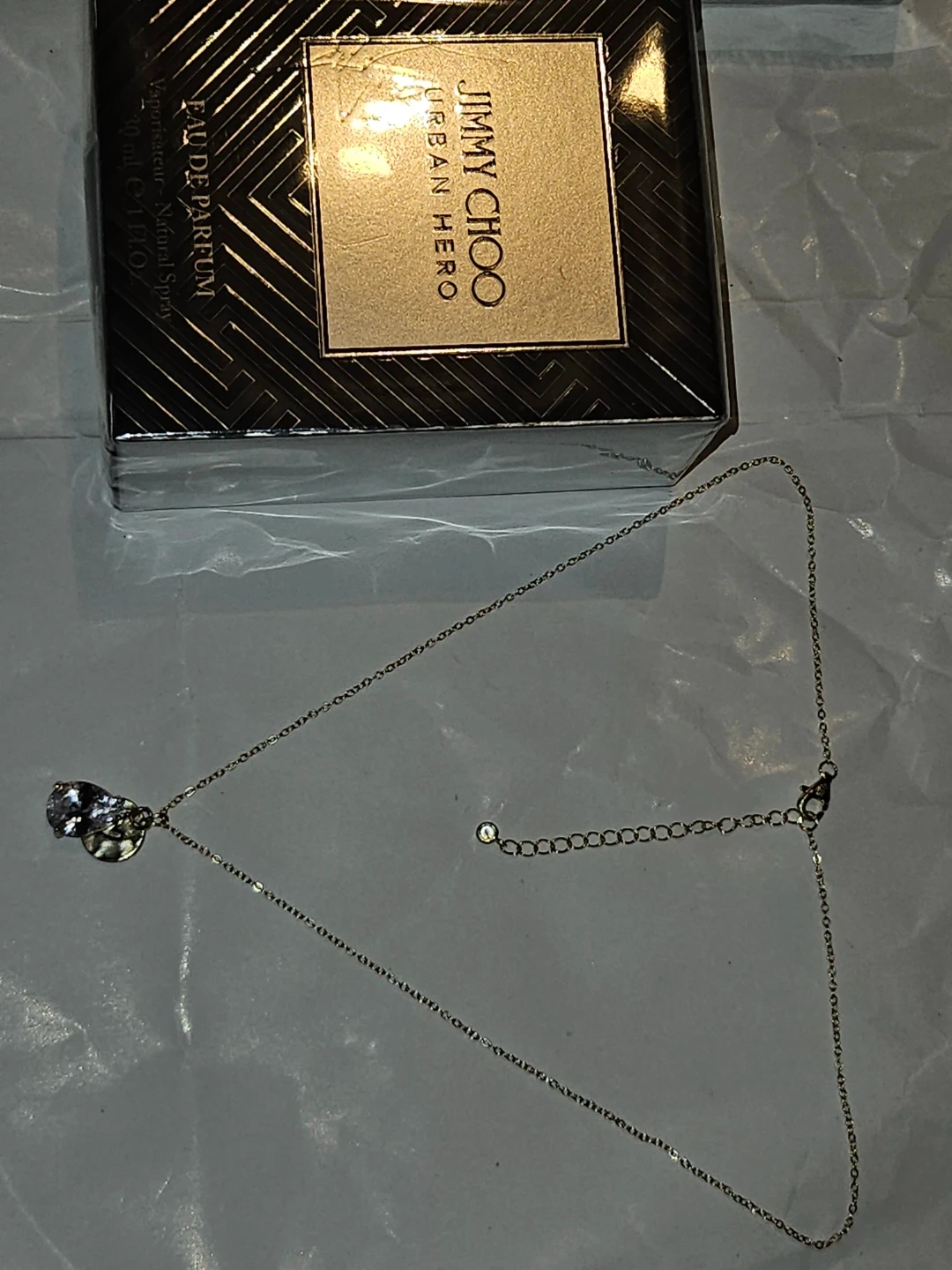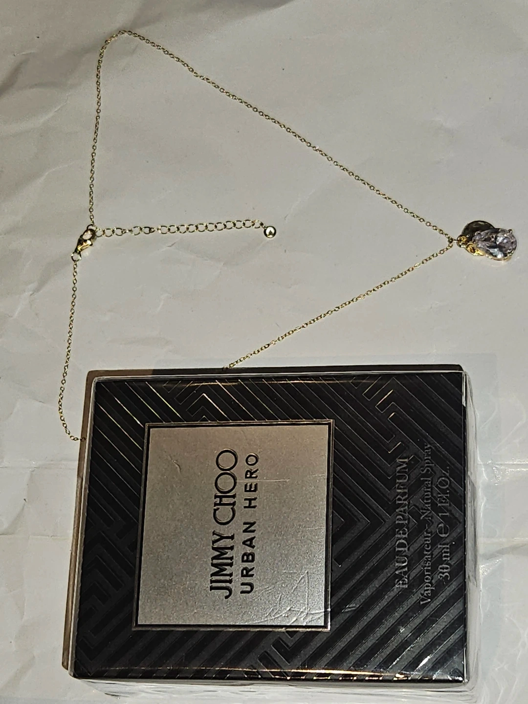 This is a necklace set featuring a delicate S925 gold plated chain with a pear-shaped 3crt moissanite pendant and a small disc charm. It comes with a 30ml bottle of Jimmy Choo Urban Hero Eau de Parfum. The perfume is a natural spray, 1 fl. oz.