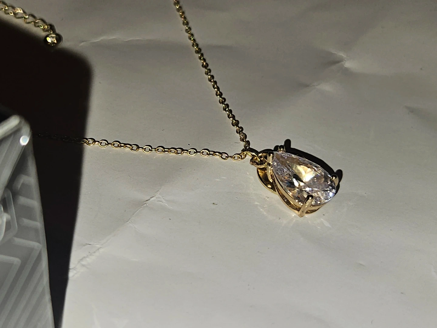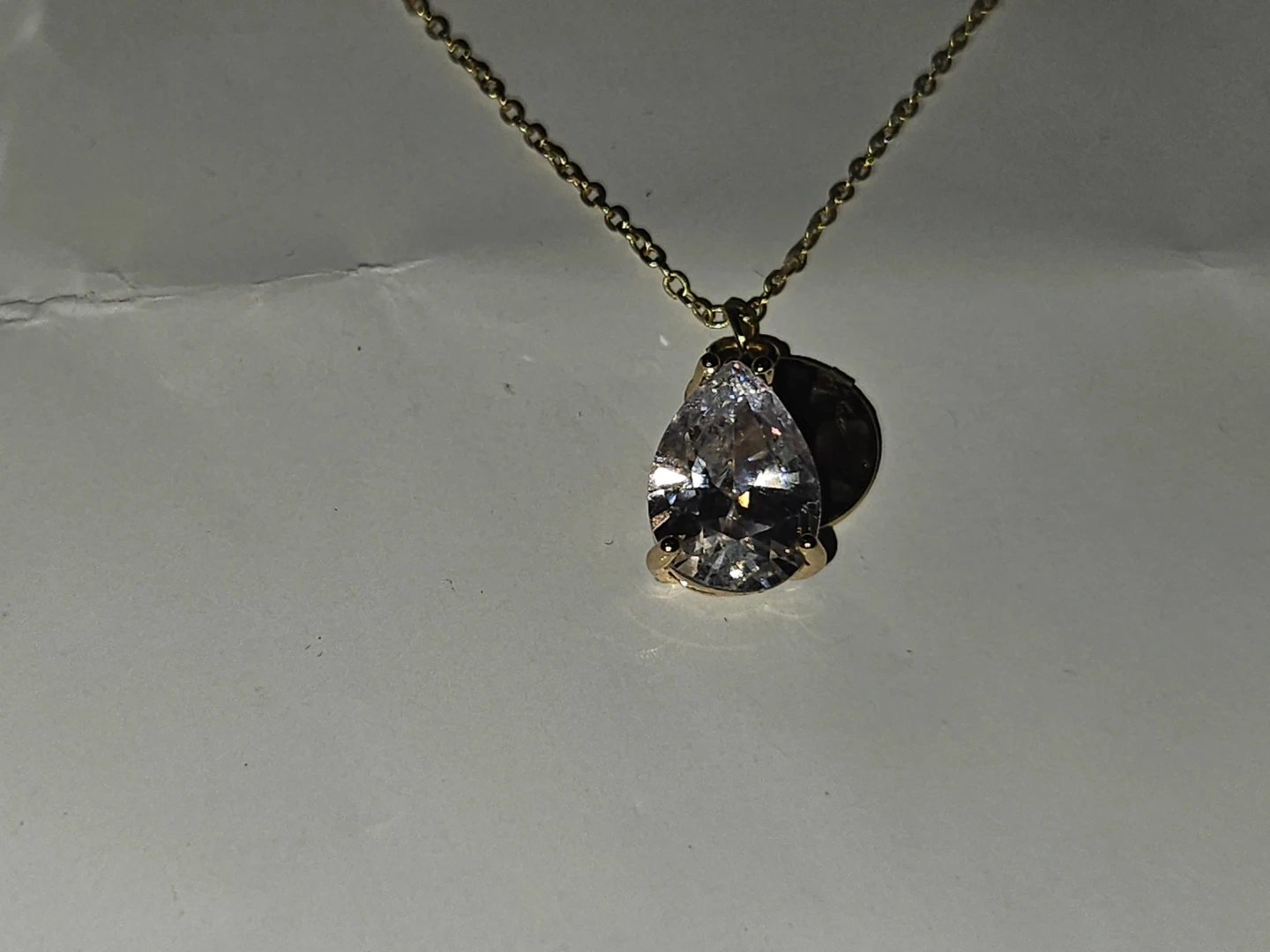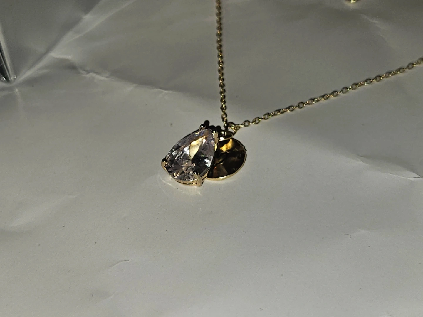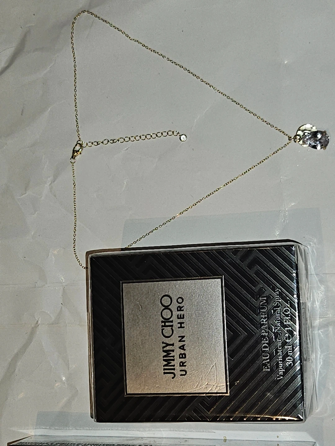 This is a necklace set featuring a delicate S925 gold plated chain with a pear-shaped 3crt moissanite pendant and a small disc charm. It comes with a 30ml bottle of Jimmy Choo Urban Hero Eau de Parfum. The perfume is a natural spray, 1 fl. oz.