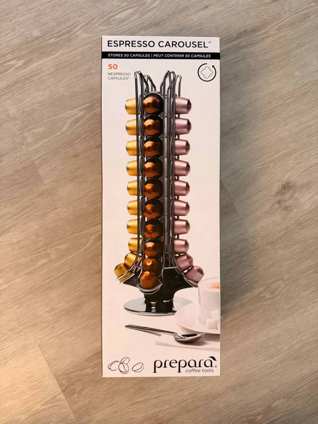 This Prepara espresso carousel stores up to 50 capsules and spins 360 degrees. It's made of metal and plastic. This carousel is perfect for keeping your espresso capsules organized and easily accessible!