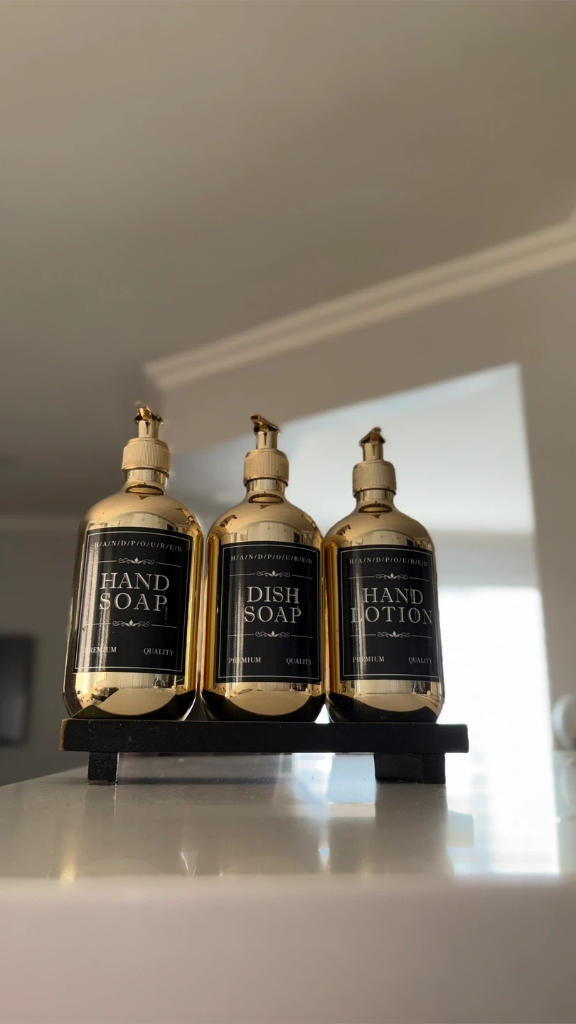 Almost new, stylish gold dispenser bottles for your kitchen. Luxury Set includes one for hand soap, one for dish soap, and one for hand lotion. These premium bottles add a touch of elegance to any counter space! The labels are waterproof. Won’t get damaged with running water when you clean dispensers. Black tray is not included. There are no scratches on dispenser.