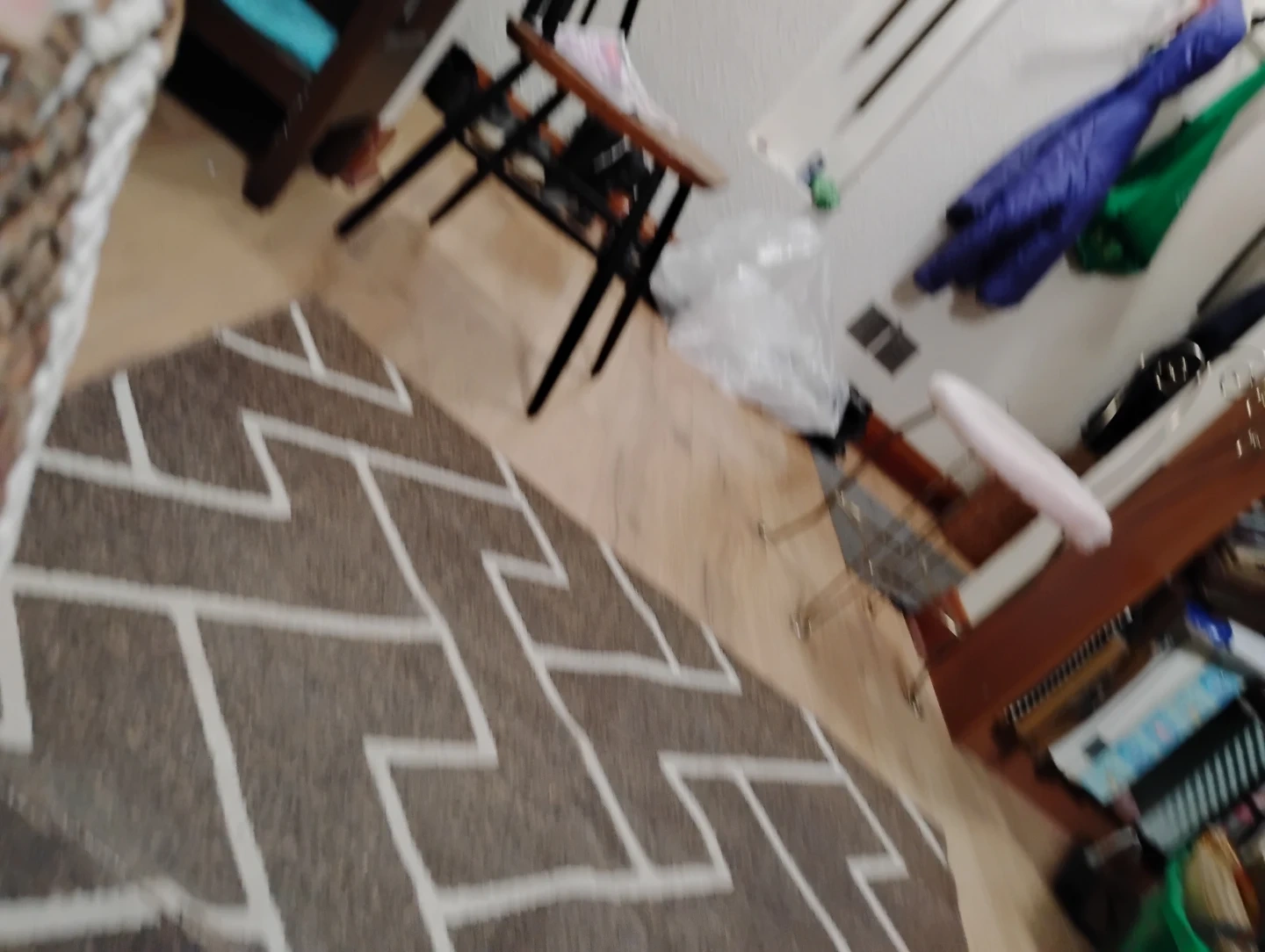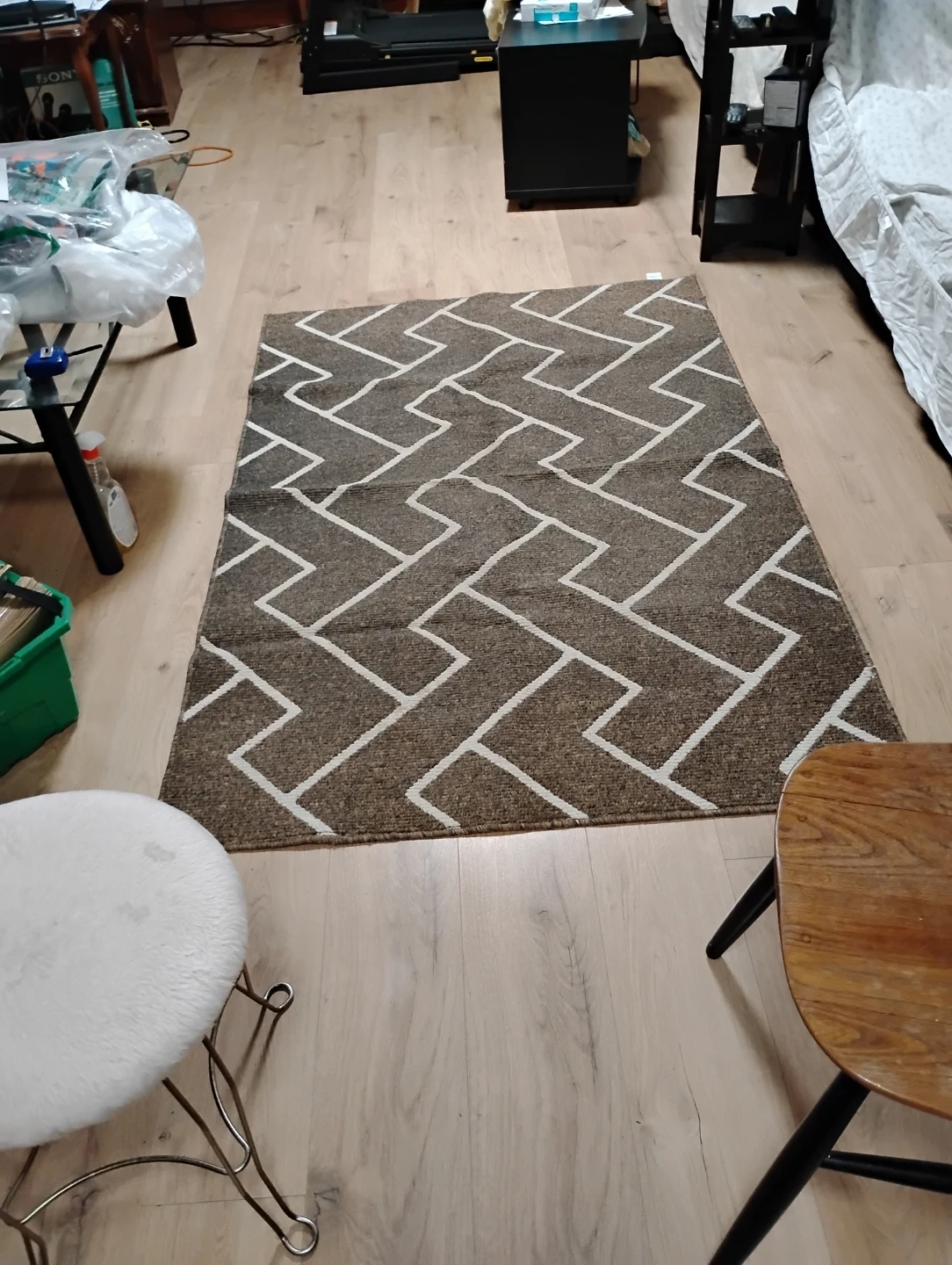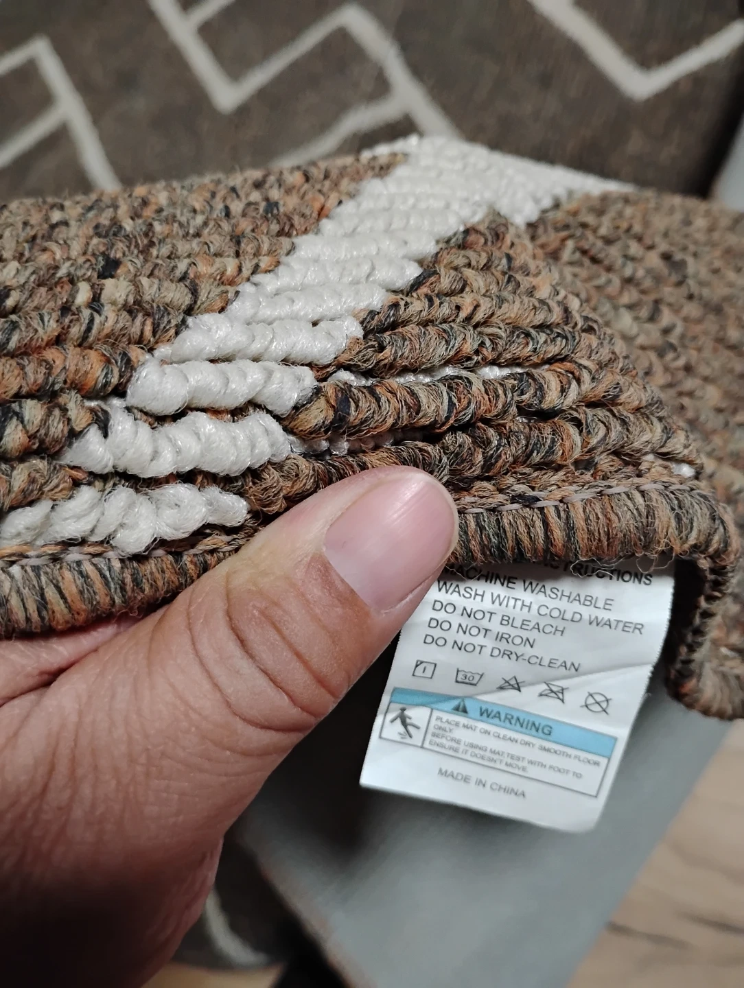 Machine washable rug with a modern geometric pattern. Includes care instructions on the tag. Made in China.