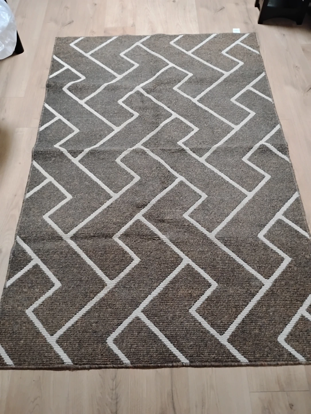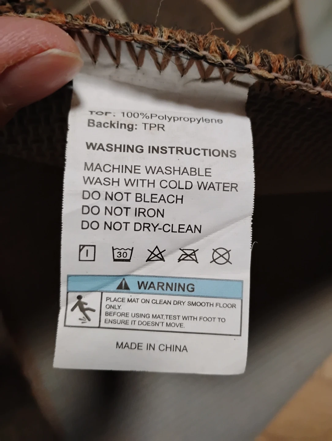 Machine washable rug with a modern geometric pattern. Includes care instructions on the tag. Made in China.