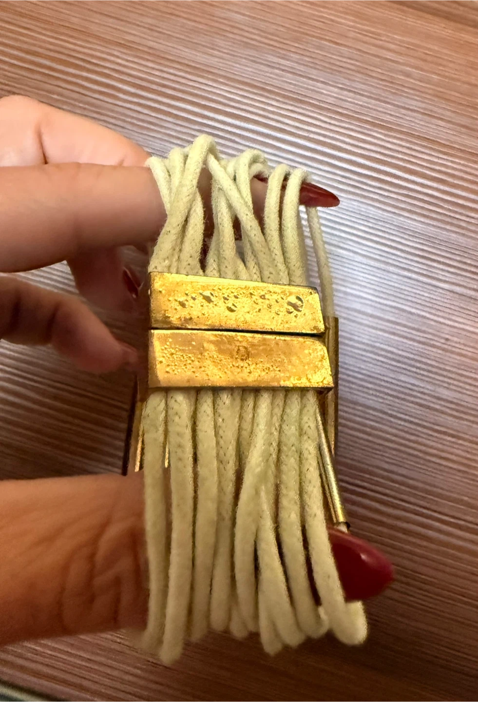 This is a stylish multi-strand bracelet featuring gold-tone metal accents and cream-coloured cords. It's a unique piece that adds a touch of elegance to any outfit. The bracelet is in great condition and ready to be worn!