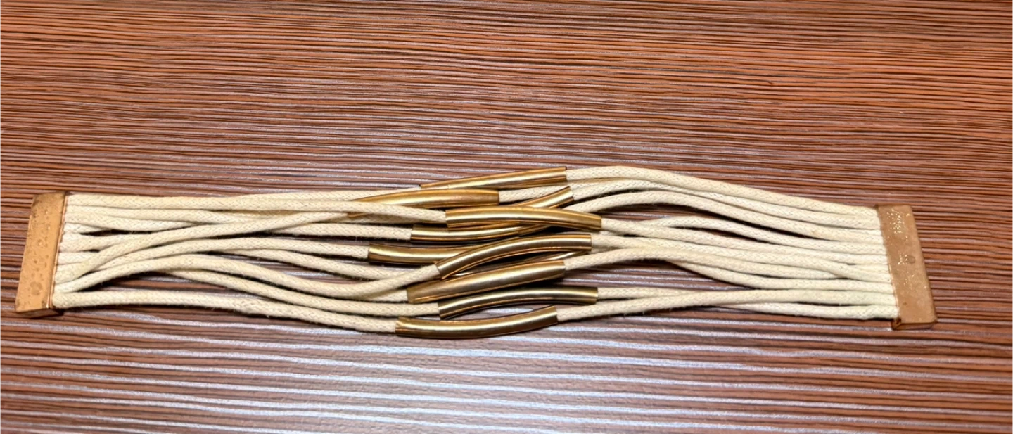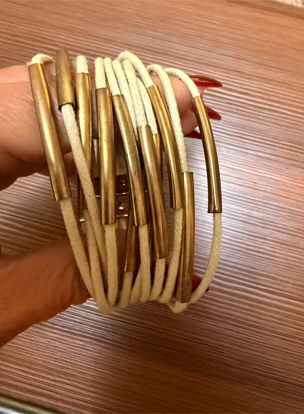 This is a stylish multi-strand bracelet featuring gold-tone metal accents and cream-coloured cords. It's a unique piece that adds a touch of elegance to any outfit. The bracelet is in great condition and ready to be worn!