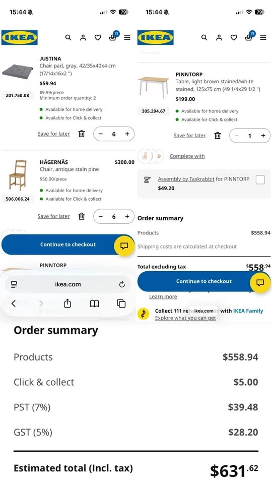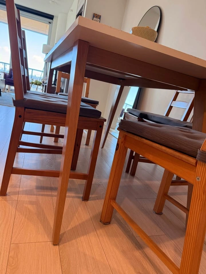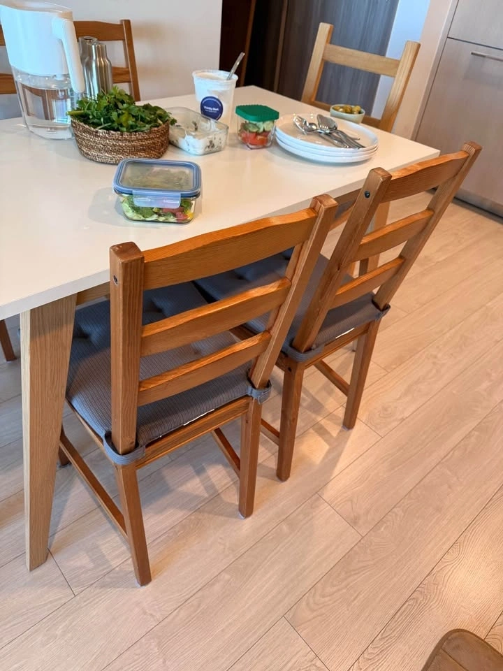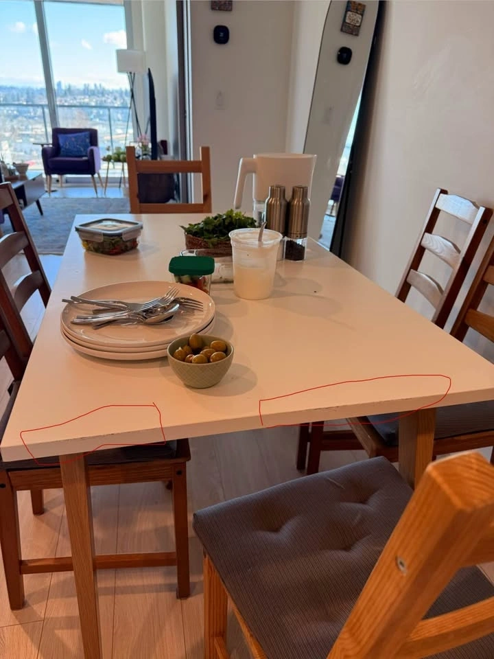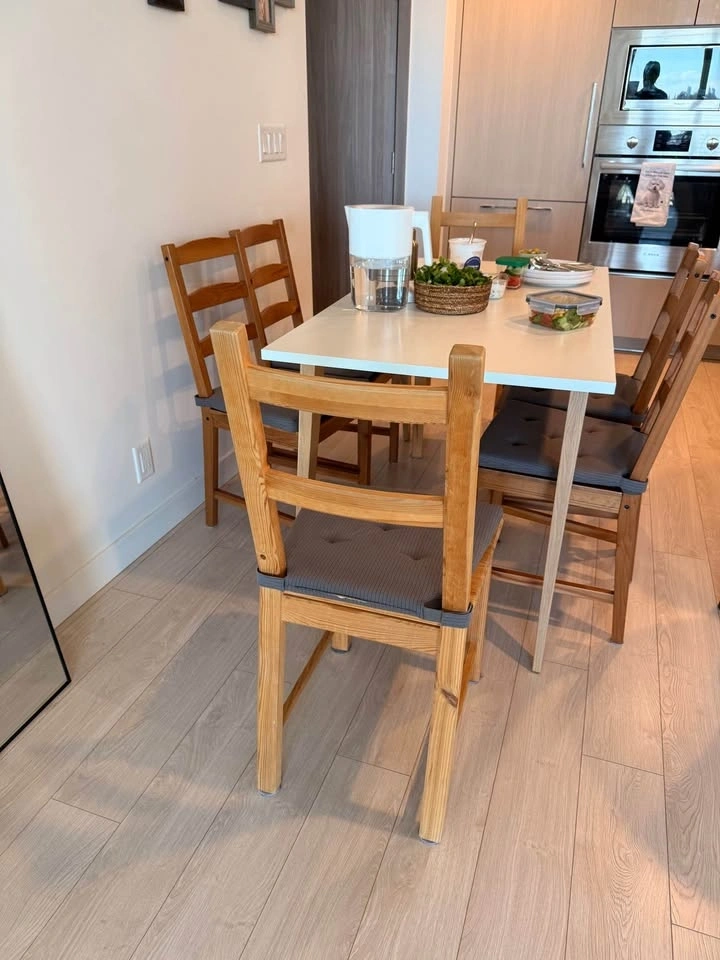 Bought this set 4 months ago for $631.32. Selling because I need a larger dining set for 8 people. Overall in excellent condition, no scratches or damage on the chairs, table, or chair pads. There’s only a small minor defect on one edge (shown and marked in the last photo). Other than that, everything is in great shape. All 13 pieces for $350. Pick up in Burnaby.