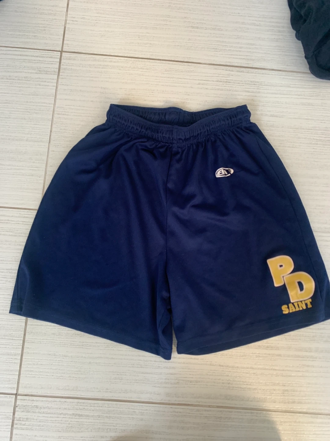 These navy blue Athletic Knit shorts are made from 100% polyester. They are labelled as Ladies' S/P, which typically means Small or Petite. The shorts feature the "PD SAINT" logo on the left leg. They're great for sports or casual wear!