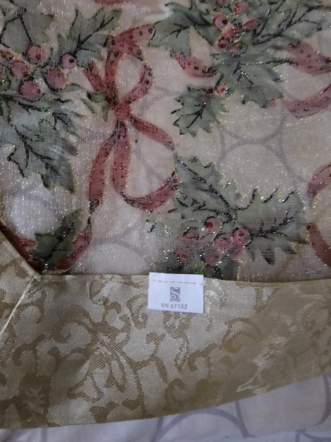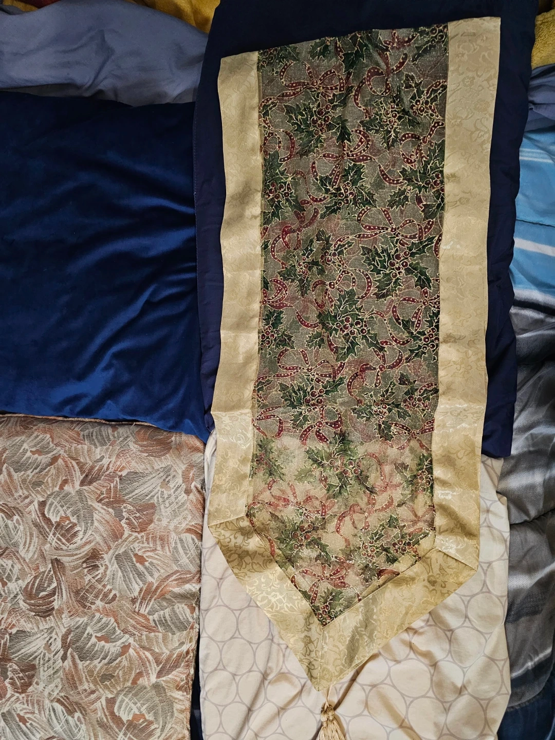 A festive table runner featuring a holly and ribbon design. It's made with a woven gold-tone border and a gold tassel. Perfect for holiday decorating!