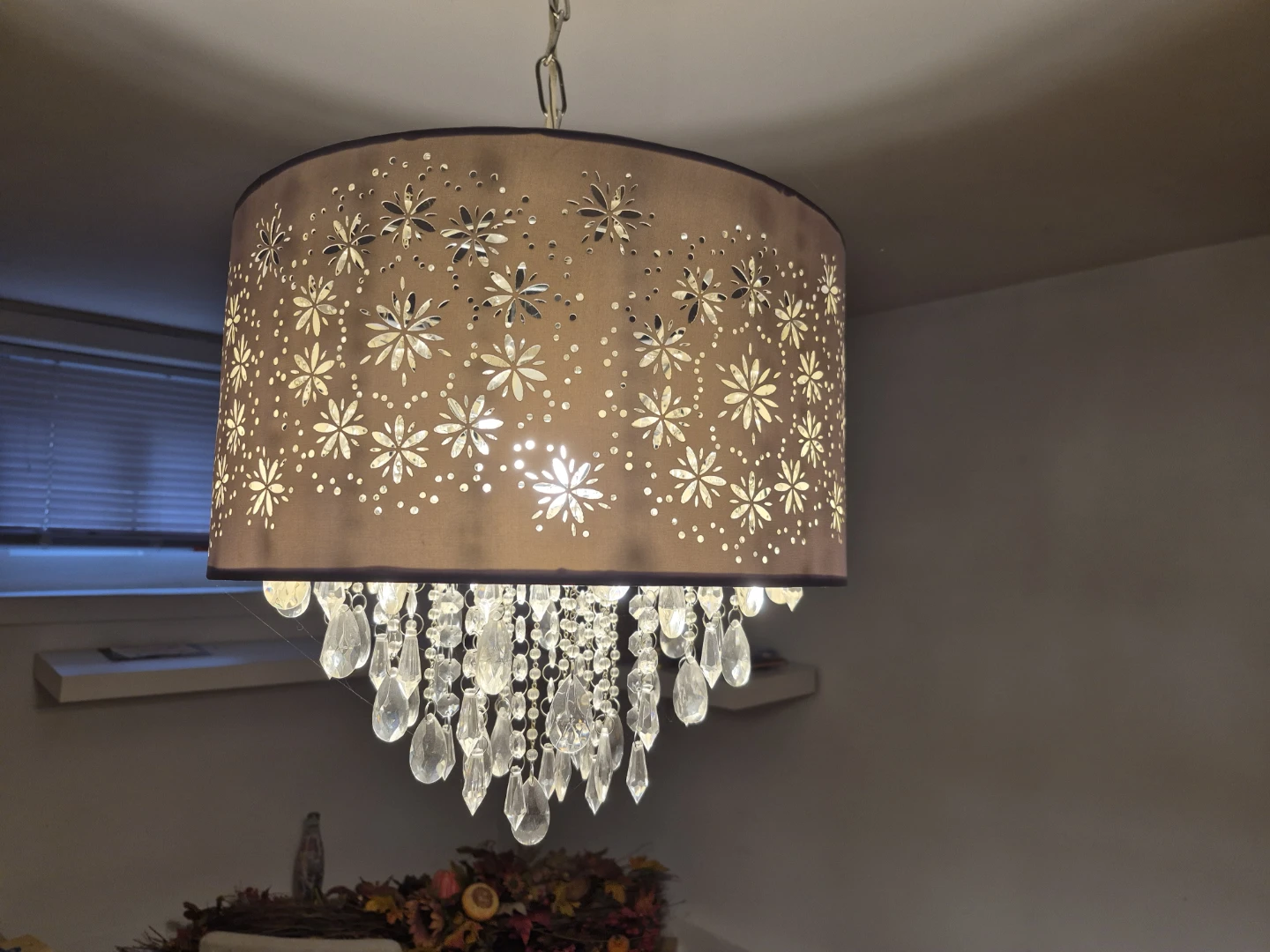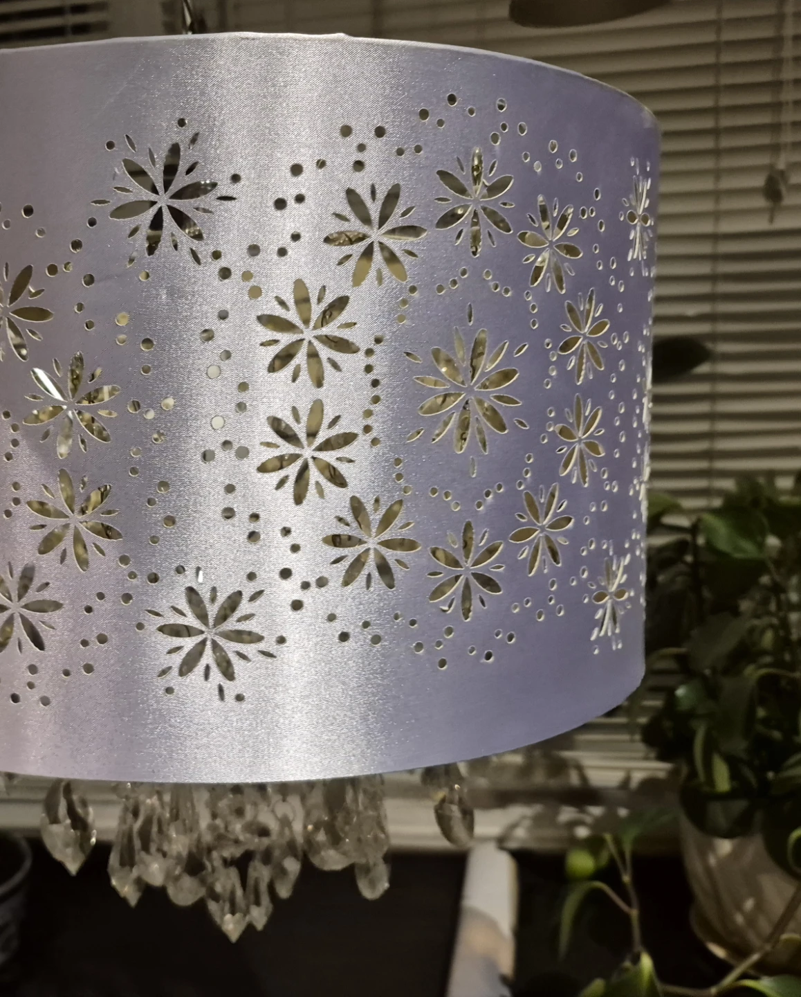 Pretty chandelier with eyelet cutout. 14" diameter. Lavender in color best represented by the close up pic. Lovely for a girl's bedroom