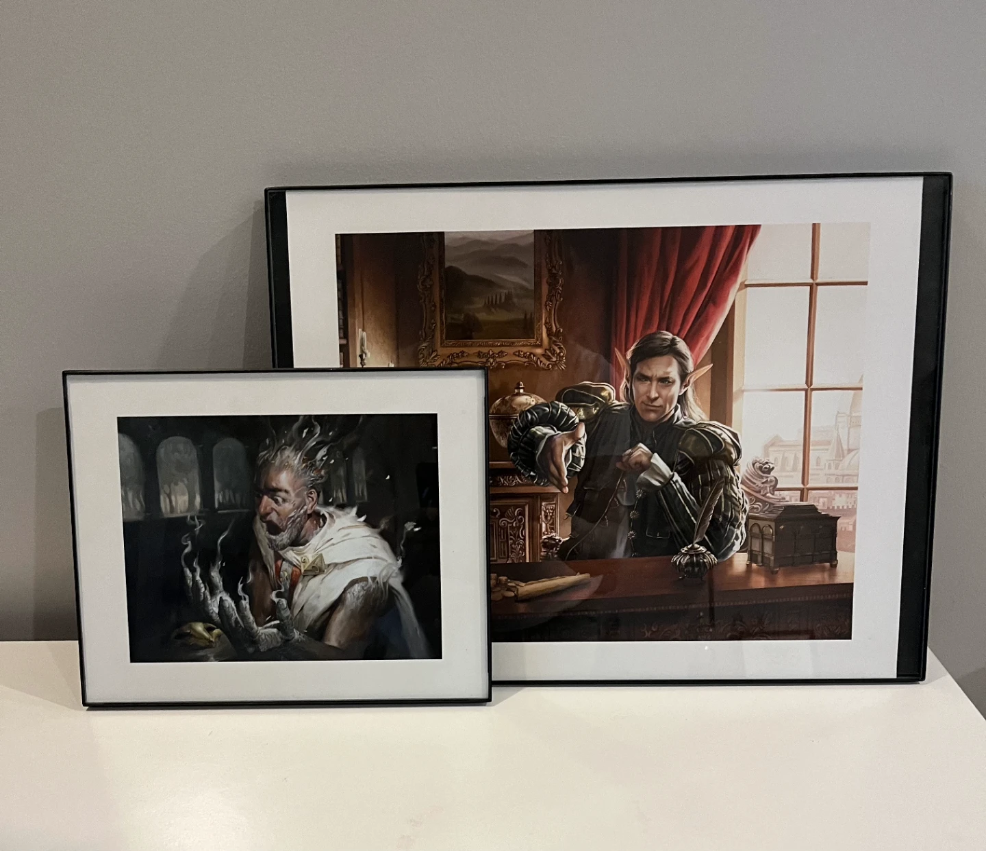 Two framed prints featuring fantasy artwork. The larger print depicts a man in historical attire at a desk, and the smaller print shows a man with a white beard and mystical flames. These pieces would be great for a collector or fan of fantasy art.