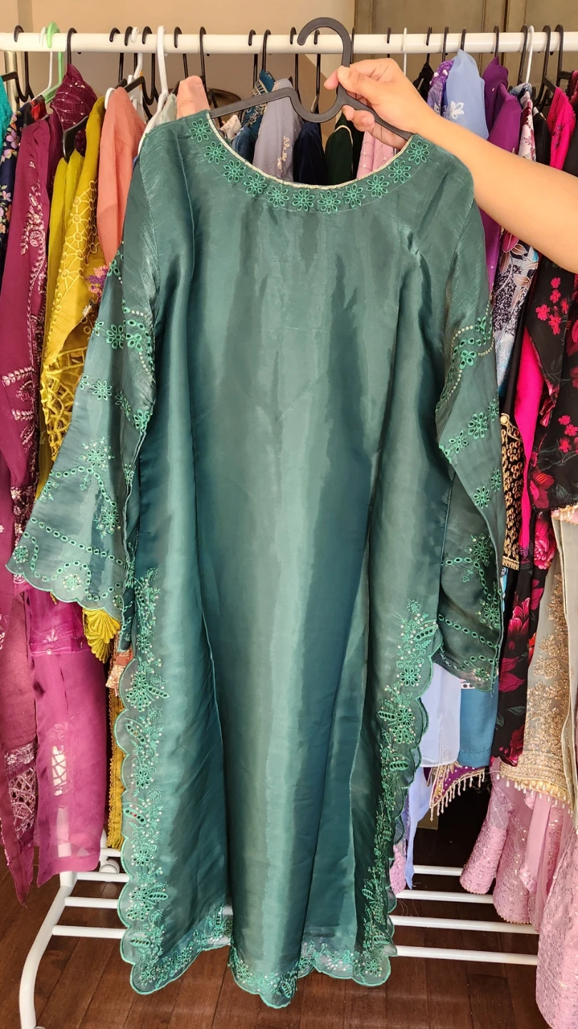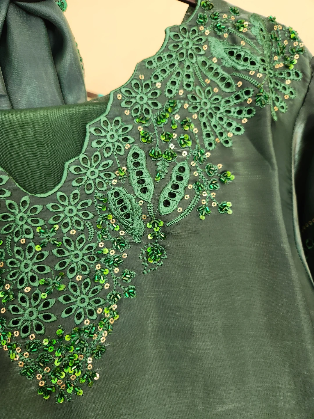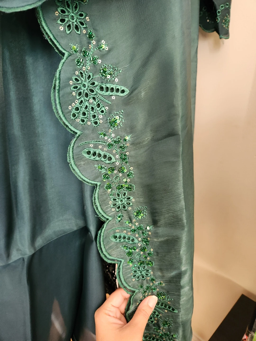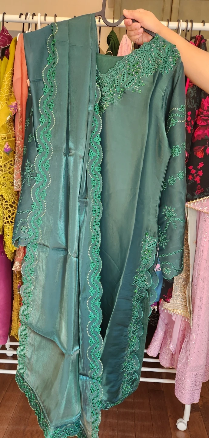 Luxurious sheesha silk suit with Embroidered sequence work and cut work in an elegant colour