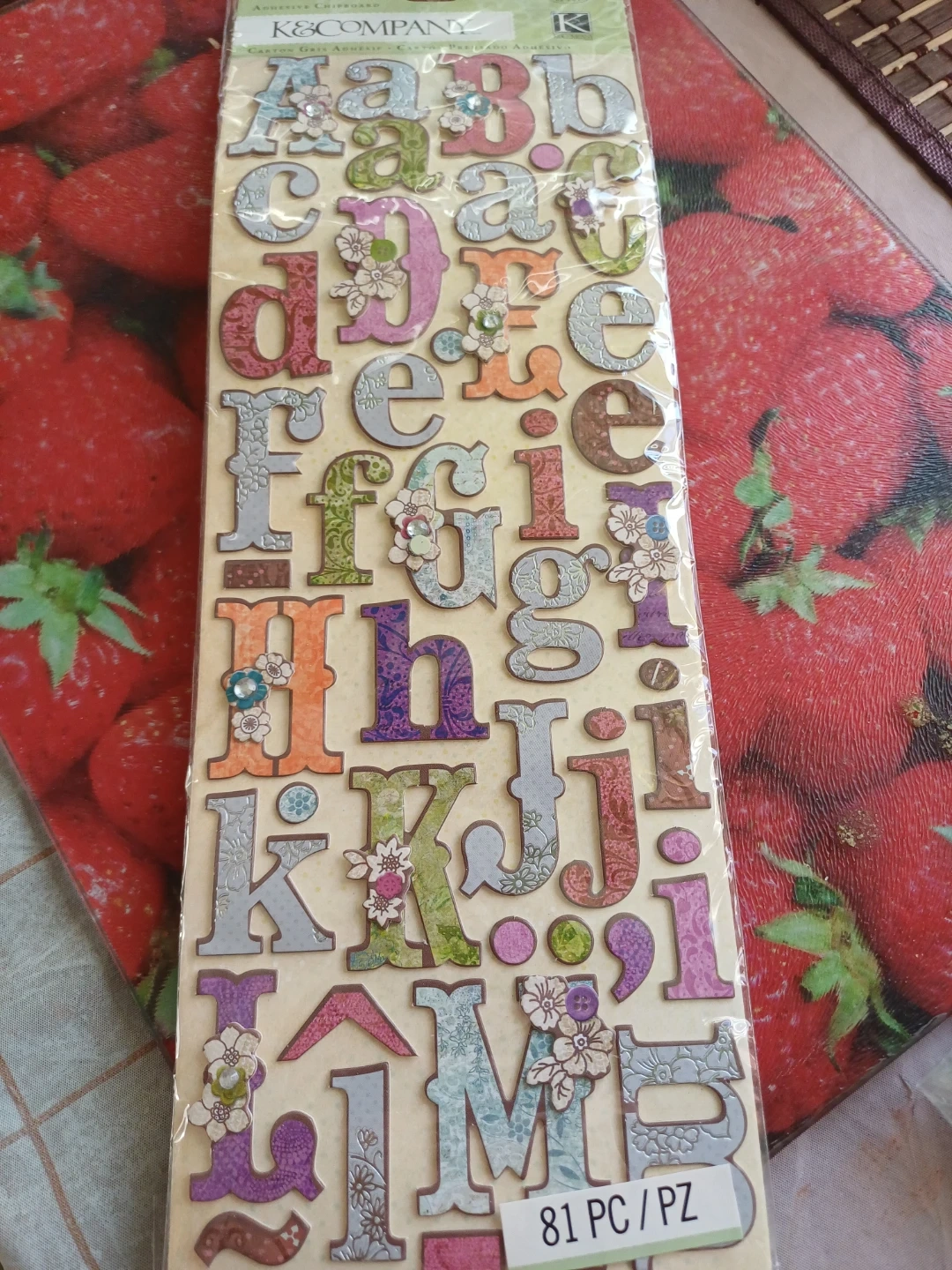 I'm selling a set of K&Company Grand Adhesions alphabet stickers. These stickers feature a variety of colourful and decorative letters, perfect for adding a personal touch to crafts, scrapbooks, and other creative projects. The package contains 81 pieces.