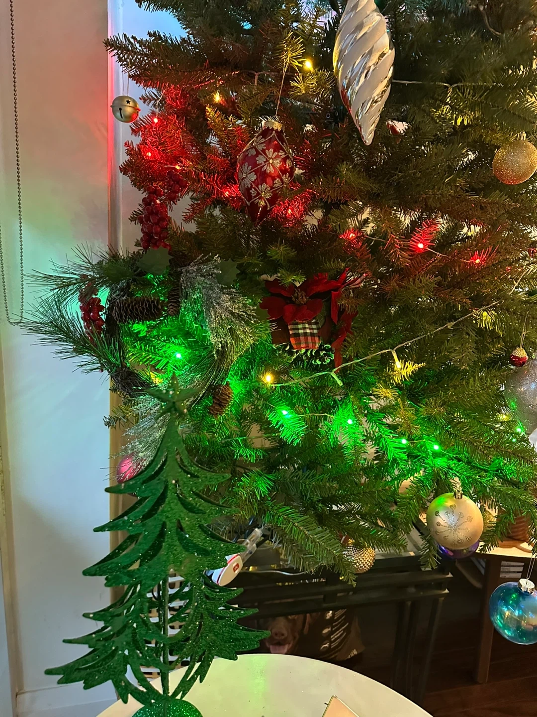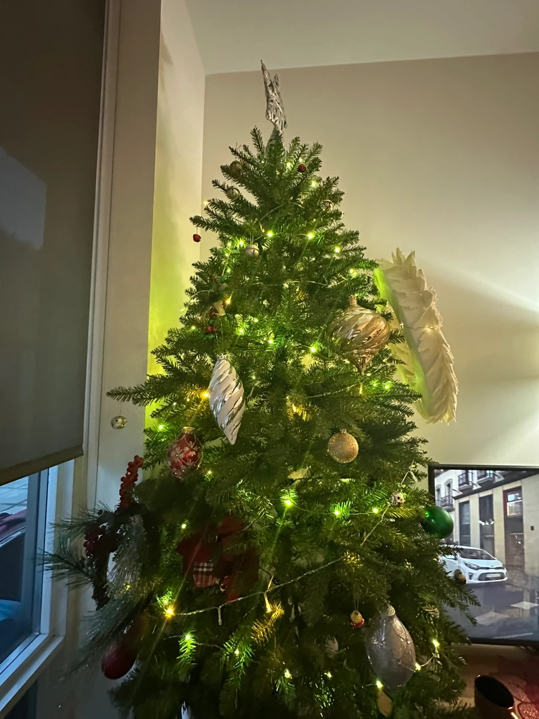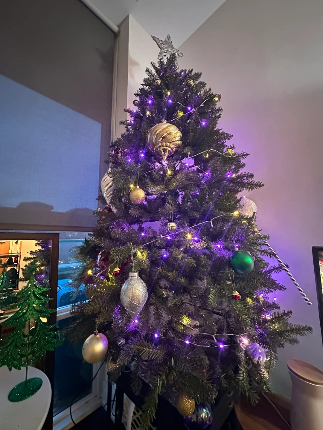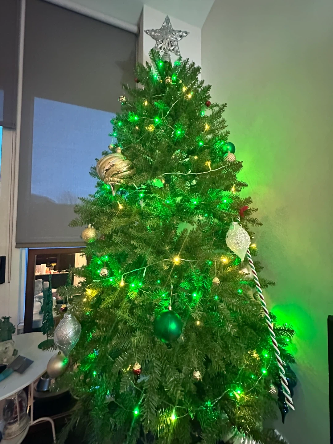 A pre-lit artificial Christmas tree adorned with various ornaments. Features include warm white and green LED lights, along with a selection of baubles and decorative pieces. A star topper is included. Perfect for your holiday decorations!