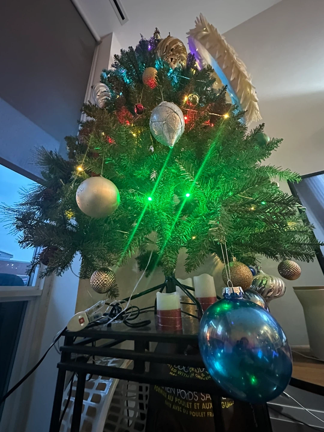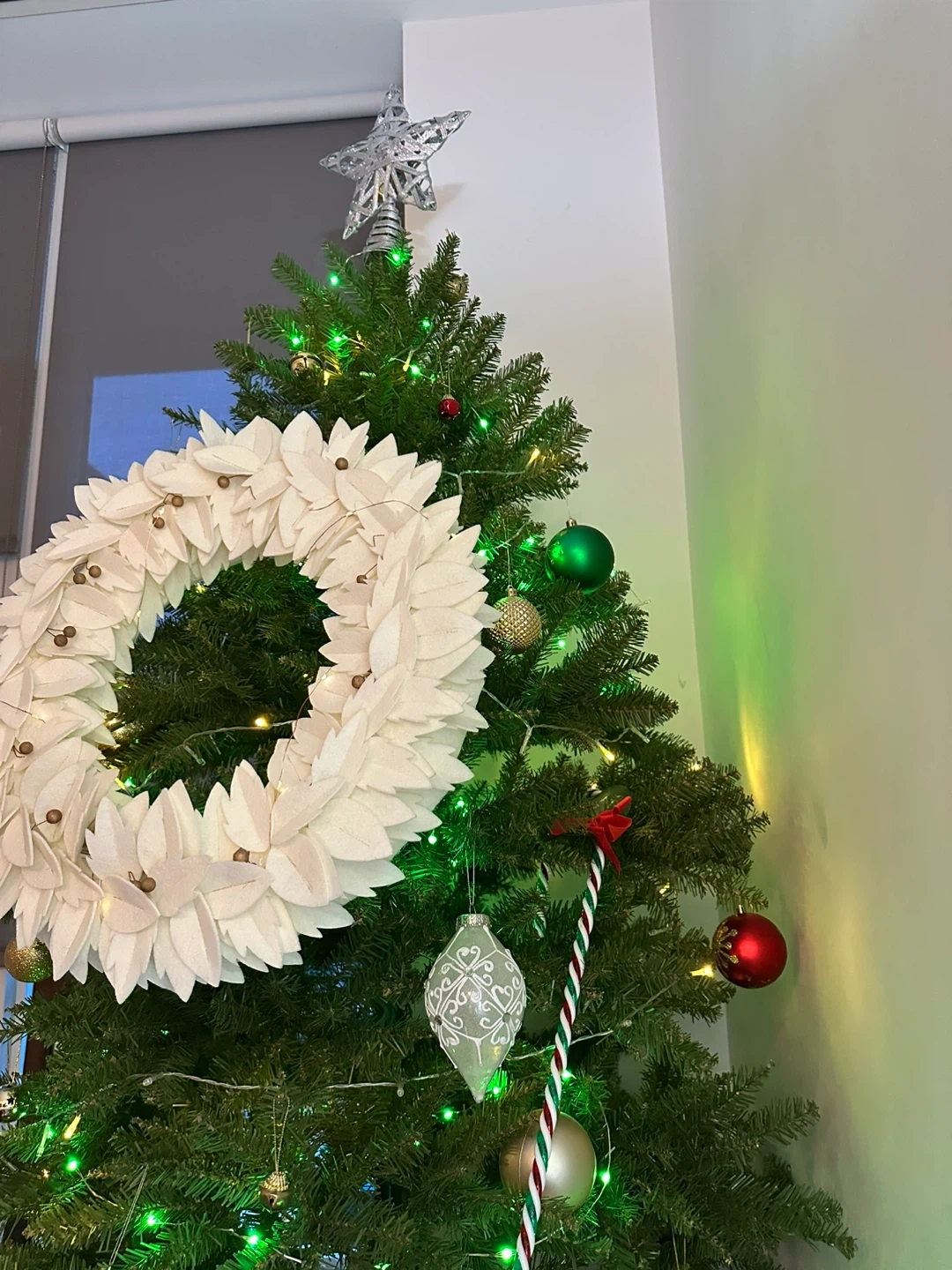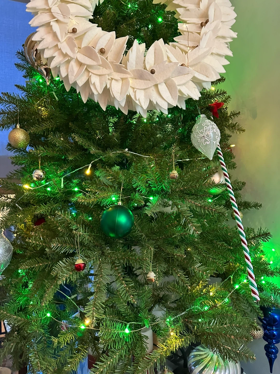 A pre-lit artificial Christmas tree adorned with various ornaments. Features include warm white and green LED lights, along with a selection of baubles and decorative pieces. A star topper is included. Perfect for your holiday decorations!