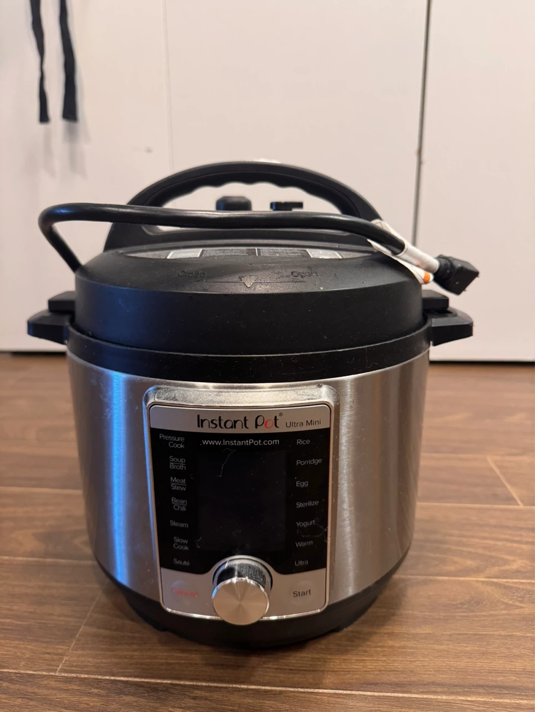Instant Pot Ultra Mini pressure cooker. It has settings for rice, porridge, egg, sterilize, yogurt, warm, and ultra. This appliance is great for quick meals!