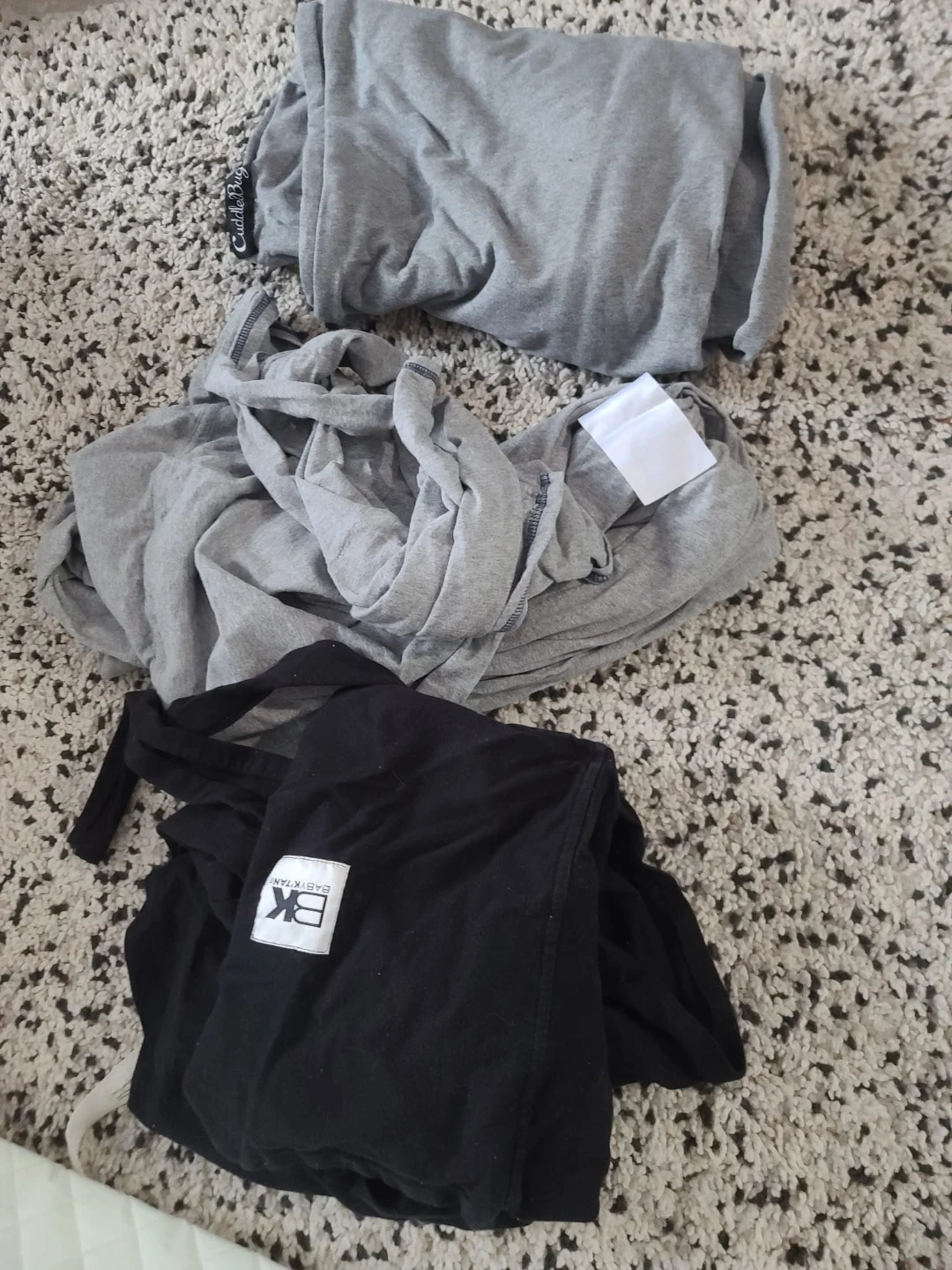 This is a black Baby K'tan baby carrier. It's made of a soft, breathable cotton blend. This carrier is suitable for newborns and infants.