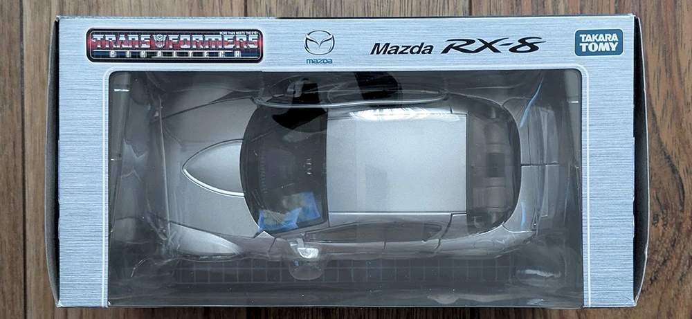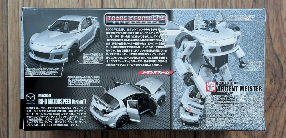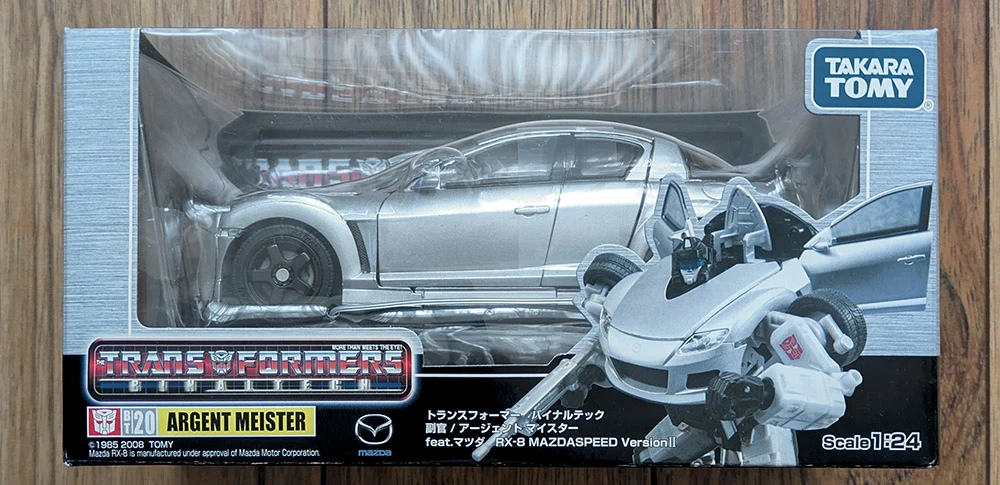 "Argent Meister", BT-20, from the Transformers Binaltech line, brand new, factory sealed. Modelled after a silver Mazda RX-8 Mazdaspeed Version II in 1:24 scale.