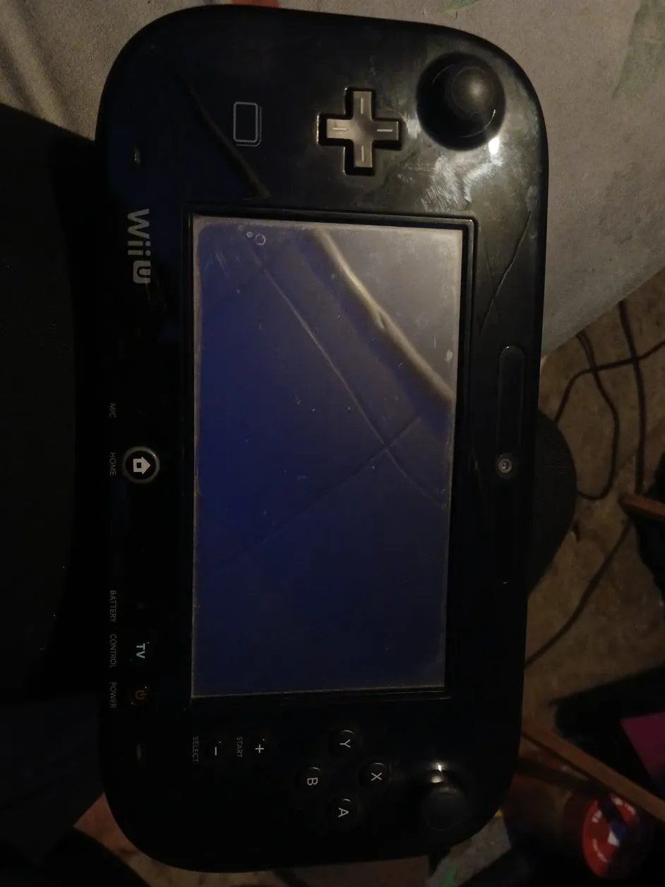 This is a black Nintendo Wii U GamePad. It has a touchscreen and standard controller buttons. Includes power and control buttons.