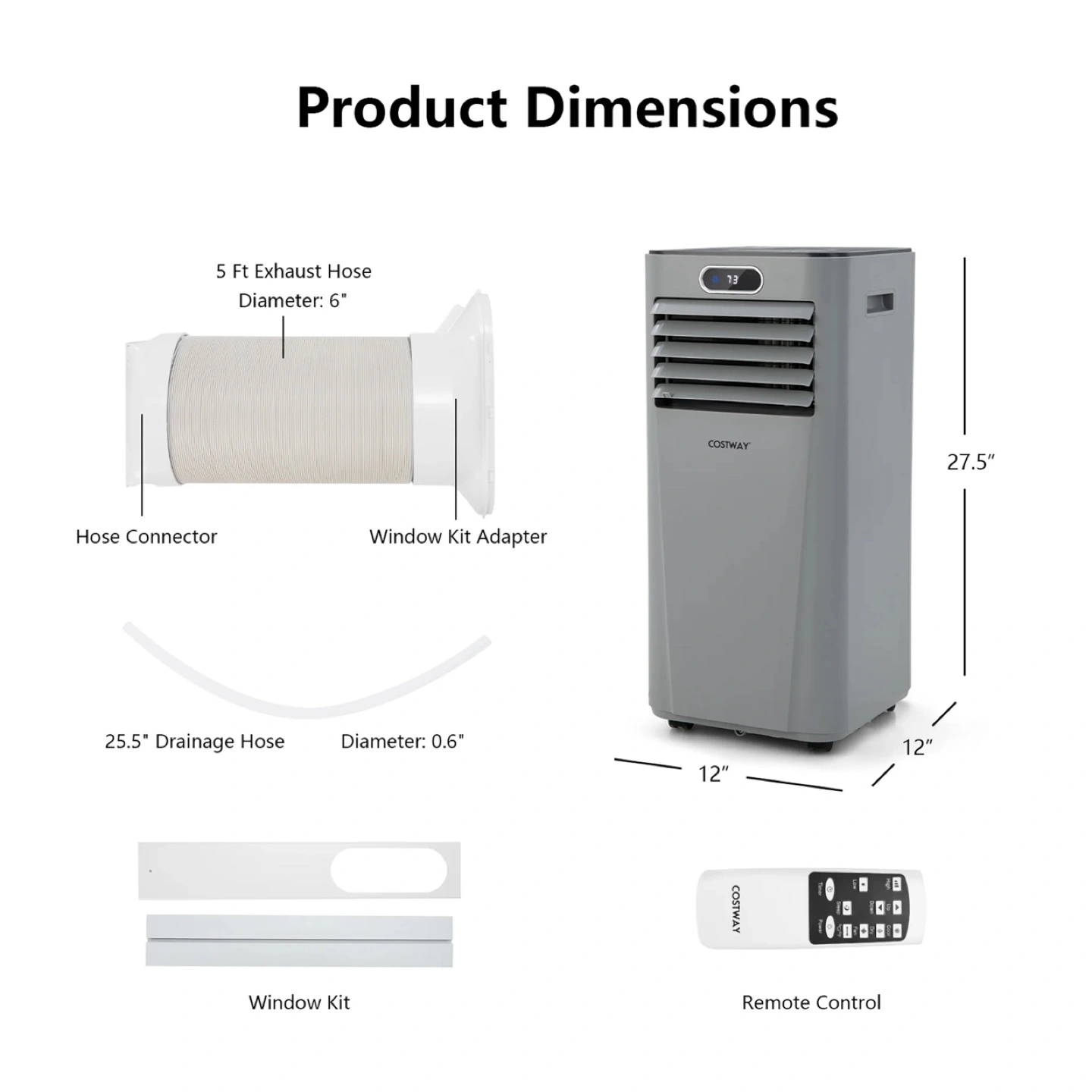 A portable air conditioner, in grey. Has a digital display. Includes remote control. The unit also has a window kit. Keep a cool, pleasant atmosphere with this air conditioner.