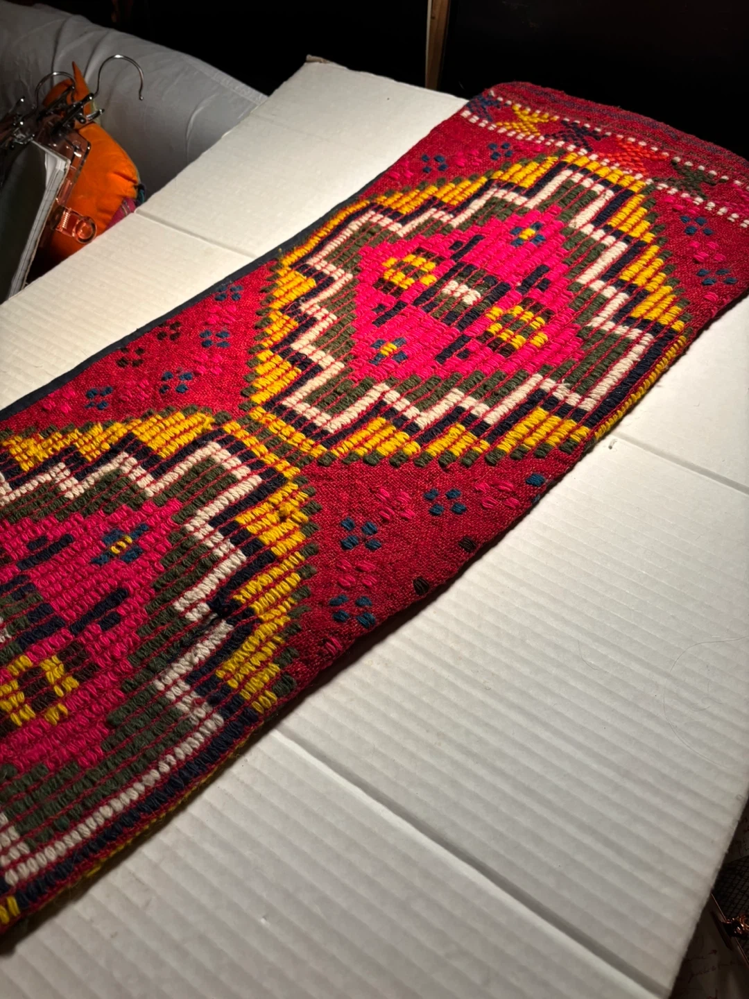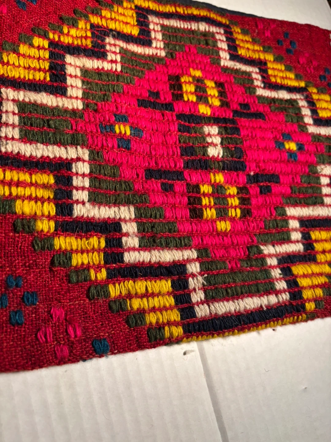 This is a handcrafted Bulgarian wooo textile with a vibrant geometric design, can be used as a pillowcase as the underside is pocket- shaped - It features intricate weaving in shades of red, pink, yellow, and green. This piece could be used for decorative purposes or as part of a larger craft project. Its unique pattern makes it a striking accent item that brings emotional warmth and luck !