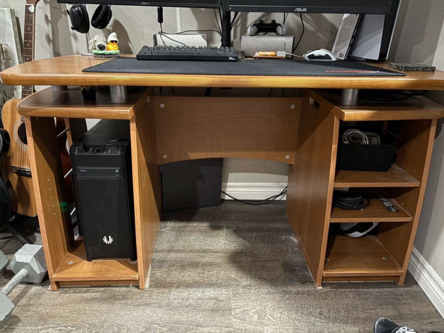 Spacious computer desk, light brown wood finish. Features built-in shelving units on either side. Great for home office or gaming setup. Some minor wear and tear.