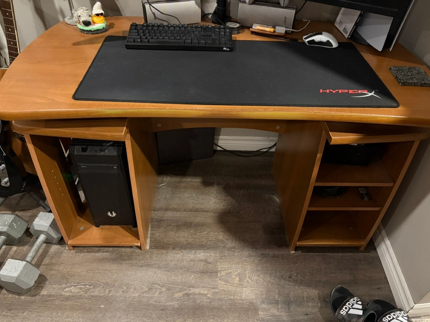 Spacious computer desk, light brown wood finish. Features built-in shelving units on either side. Great for home office or gaming setup. Some minor wear and tear.