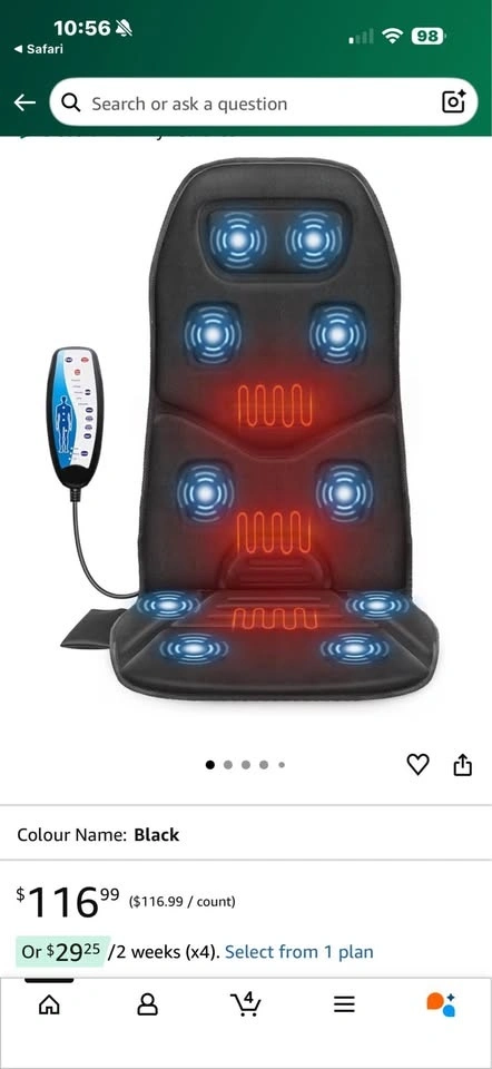 Selling a brand new Comfier massage seat cushion, model CF-2206G, in gray. It has 10 modes of heating and massage. Specs: 24W power, 12V 2.0A input, size 17x7x12.6 inches, weighs 4.6 lbs. Comes in the original box. Retails for $116 plus tax. Asking $75.
