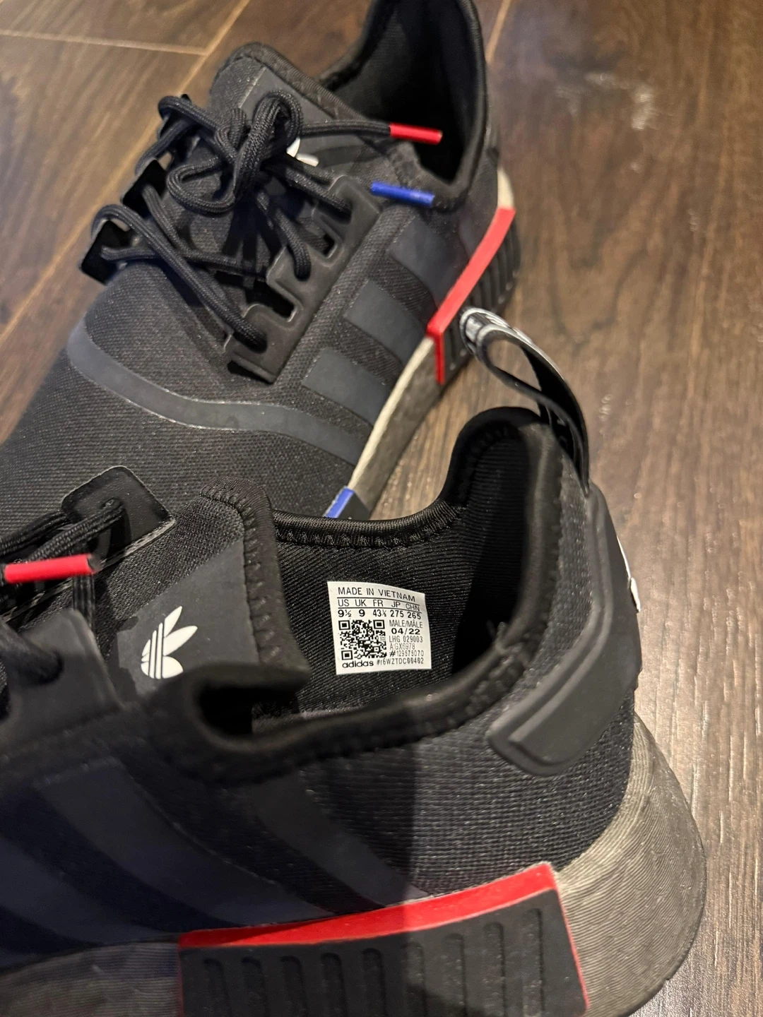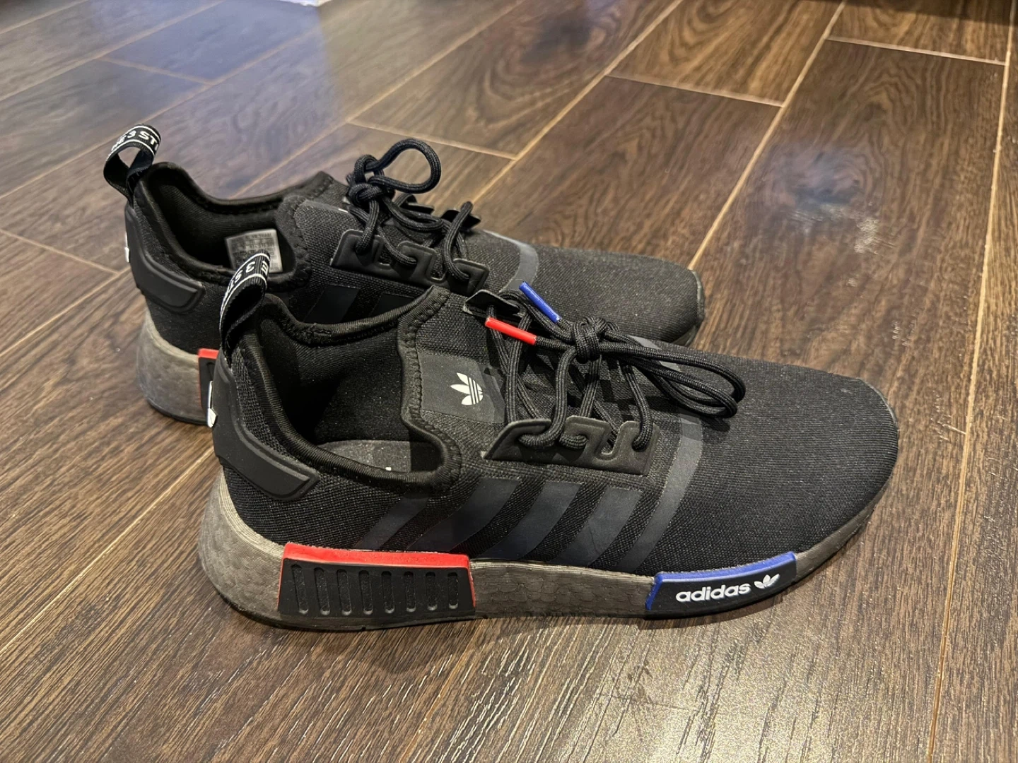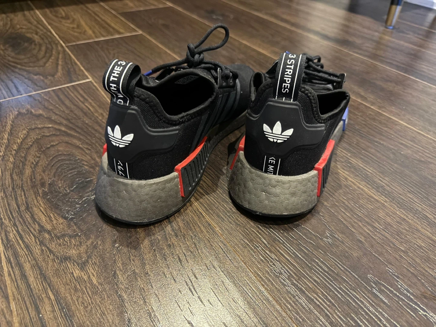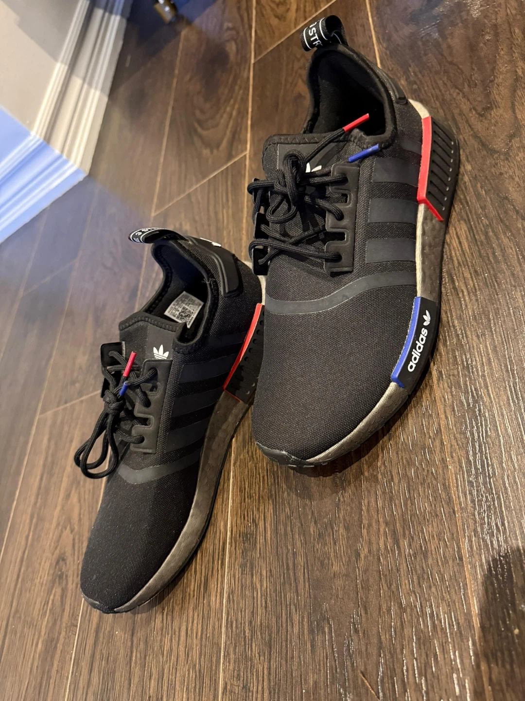 Black Adidas NMD_R1 running shoes with red and blue accents. Made in Vietnam. Size 10 US Men's. Pick up at either Bathurst and center, or Richmond Hill!