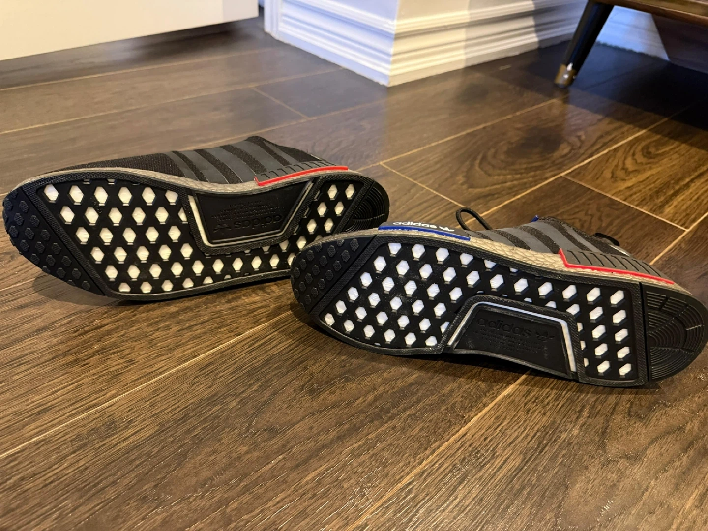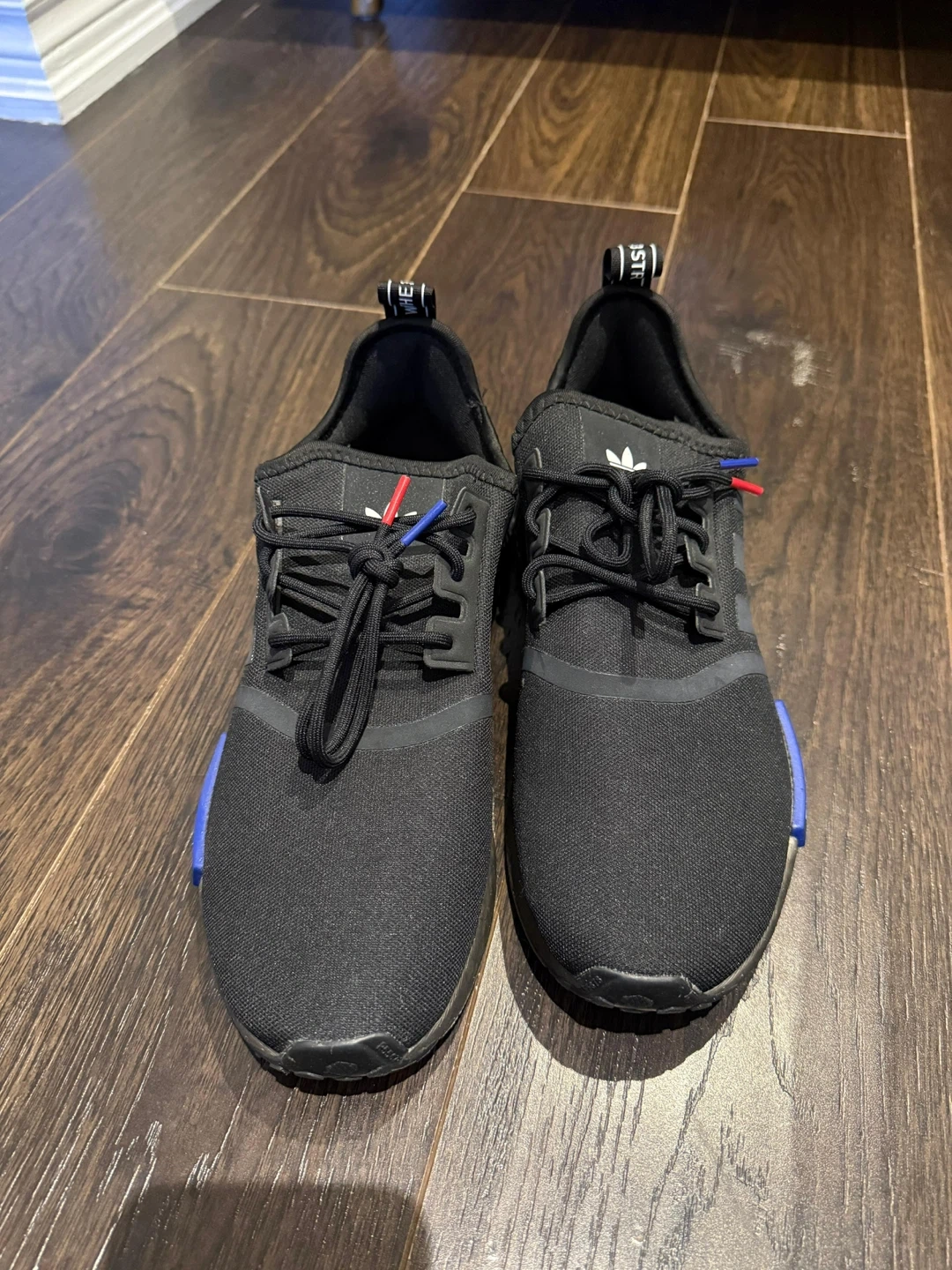 Black Adidas NMD_R1 running shoes with red and blue accents. Made in Vietnam. Size 10 US Men's. Pick up at either Bathurst and center, or Richmond Hill!